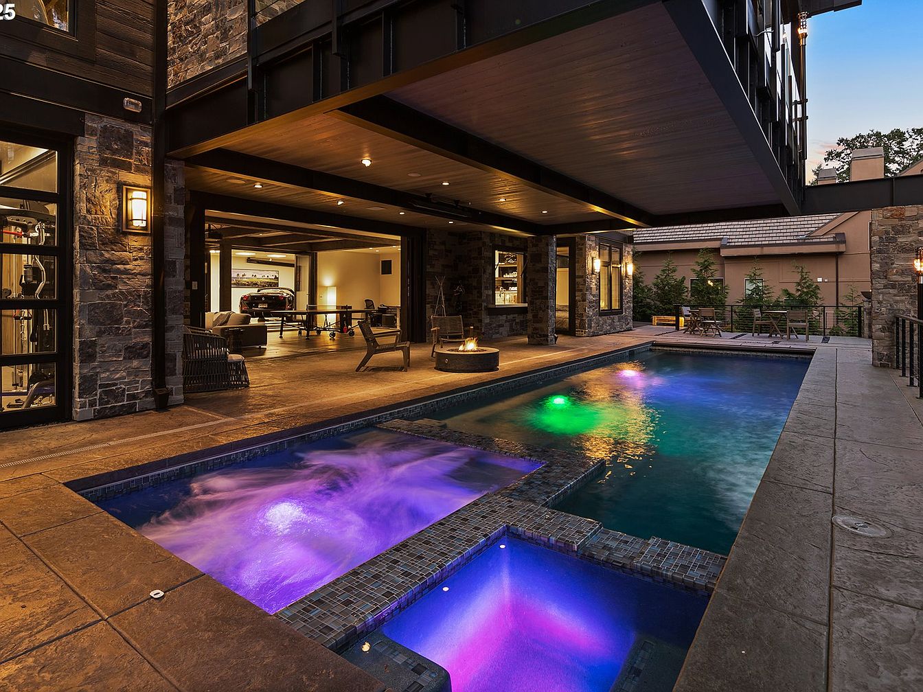 Modern outdoor living meets luxury in this covered pool patio, featuring a sleek geometric pool and adjacent spa illuminated with vibrant, color-changing LED lights. The architectural design showcases a thoughtful blend of natural stone, dark wood finishes, and industrial touches, creating a warm yet contemporary feel. Comfortable lounge chairs and a cozy fire pit encourage gatherings and family fun. The open transition between indoor and outdoor spaces, visible through wide glass doors, enhances both accessibility and safety. Neutral earth tones balance the striking lighting and modern materials, all contributing to a sophisticated yet welcoming atmosphere for all ages.