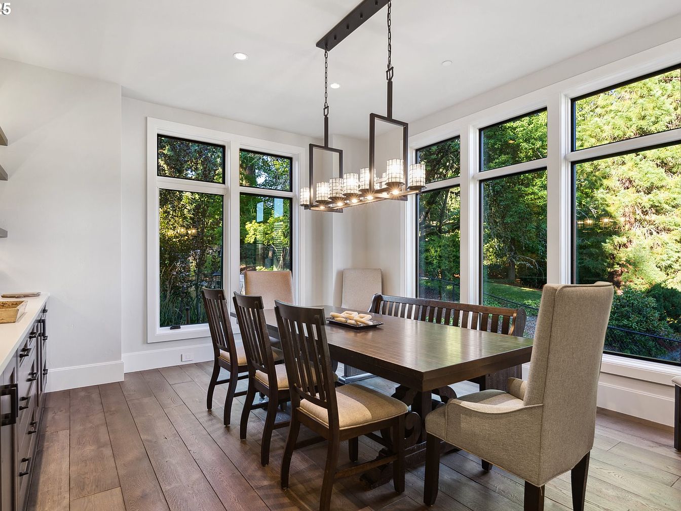 Natural light pours into this inviting dining space through expansive, floor-to-ceiling windows that frame views of lush greenery, creating a peaceful ambiance ideal for family meals. The room features a sturdy wooden table surrounded by matching dark wood chairs and two plush armchairs at either end, balancing comfort and elegance. Soft, neutral tones on the walls and upholstery give the room a warm and welcoming feel, while the sleek, modern light fixture overhead adds a contemporary touch. The spacious layout ensures plenty of room for gatherings, making it perfect for both everyday dining and special occasions.