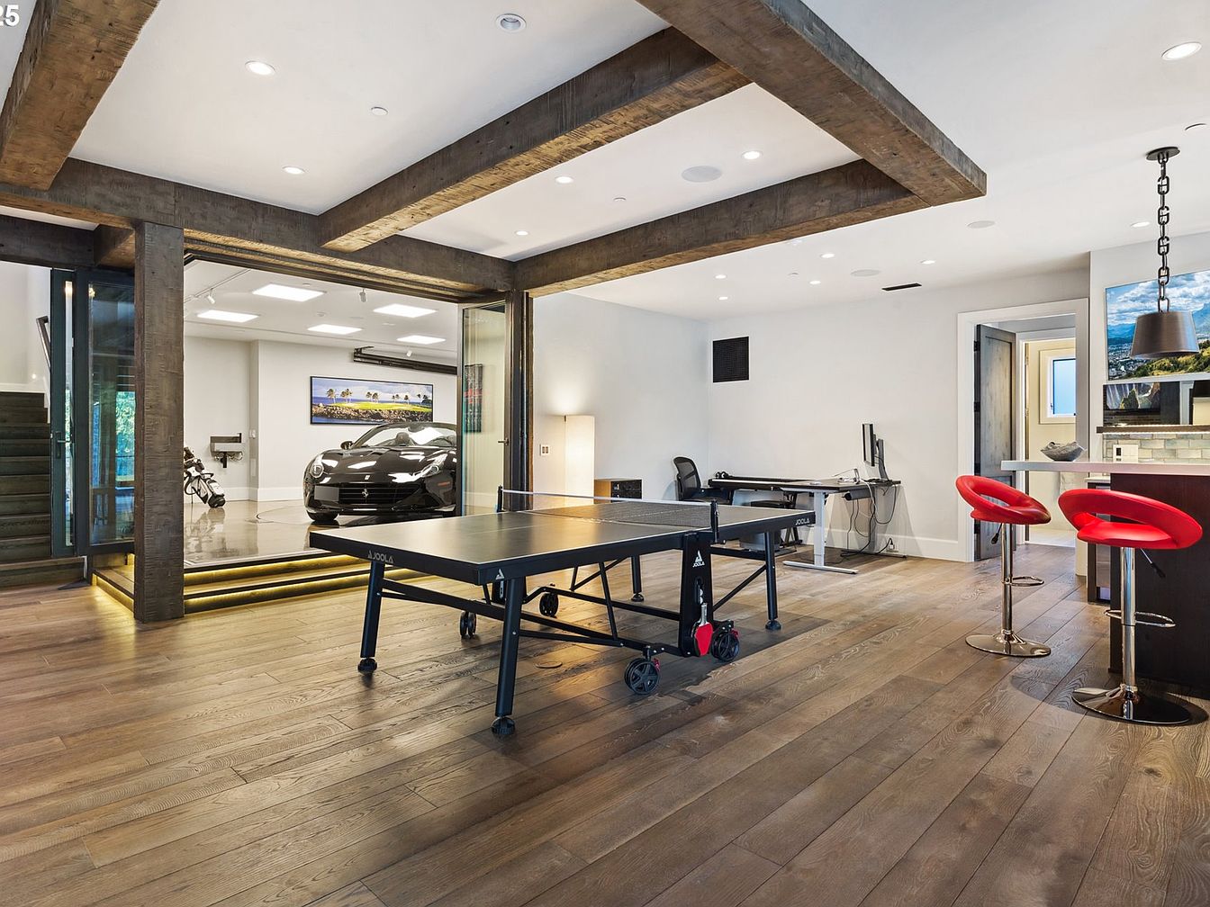A spacious, open-concept game room blends modern luxury with rustic character, featuring exposed wooden beams and wide-plank hardwood floors. Perfect for family gatherings and entertainment, the room is anchored by a ping pong table and casual seating area with vibrant red barstools at a sleek breakfast bar. Large glass doors open to an immaculate showroom-style garage, seamlessly integrating automotive elegance into the living space. A gaming or workstation setup sits at the far end, making it multi-functional for all ages. Neutral wall colors and ample natural light enhance the inviting, airy atmosphere, ideal for both relaxation and recreation.