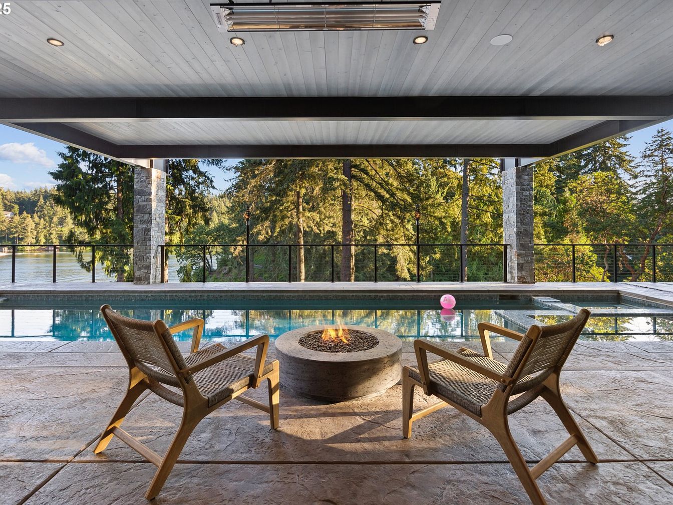 A luxurious covered patio blends seamlessly with the outdoor pool, creating an inviting space for family gatherings and relaxation. Two contemporary woven chairs encircle a sleek stone firepit, offering warmth and comfort while overlooking the serene pool and the lush greenery beyond. The wide-plank ceiling, with recessed lighting and built-in heaters, extends the patio season into cooler evenings. Floor-to-ceiling stone pillars and glass railing provide safety without sacrificing stunning views of the lake and forested scenery, ensuring a child-friendly environment. The neutral stone flooring and natural wood furniture add warmth, style, and a harmonious connection to nature.