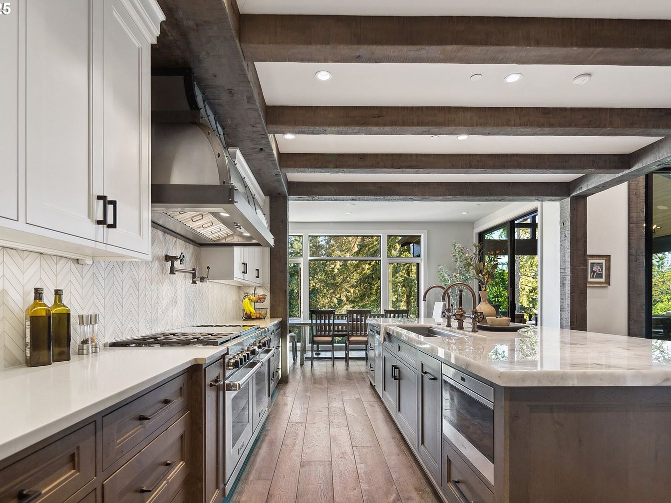 A bright, inviting kitchen with an expansive center island and integrated dining area, perfectly designed for both everyday family cooking and entertaining. Warm wood floors complement the exposed wooden ceiling beams, offering rustic charm against crisp white cabinetry. The herringbone tile backsplash, stainless steel appliances, and quartz countertops combine durability and style, making meal preparation a pleasure. Natural light pours in through large picture windows, illuminating the open layout and making the kitchen a welcoming hub for gatherings. Family-friendly details include ample counter space for projects, practical storage, and easy access to the adjacent dining space with peaceful views outside.