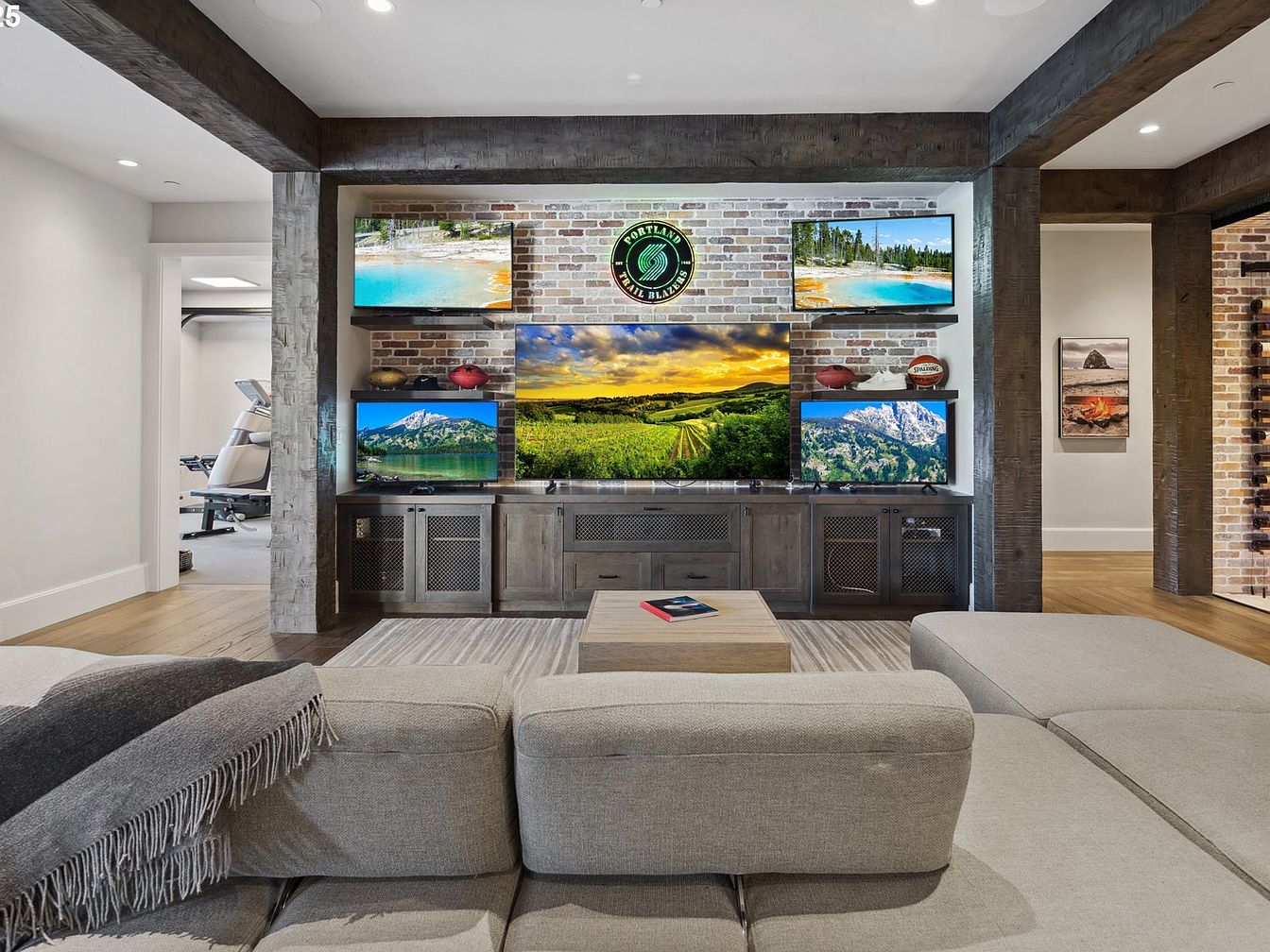 A spacious family-centric entertainment room blends rustic and modern elements, featuring a large sectional sofa perfect for gatherings and casual lounging. The highlight is a media wall adorned with five screens framed by a backdrop of exposed brick, ideal for watching multiple games or shows simultaneously, creating a dynamic viewing experience. Dark wooden beams contrast with soft neutral walls and light hardwood floors, enhancing warmth and coziness. Functional built-in cabinetry beneath the screens provides ample storage for entertainment essentials, while touches like sports memorabilia and a cozy throw blanket invite relaxation. Open walkways lead to a home gym and adjacent spaces, emphasizing accessibility and flow.