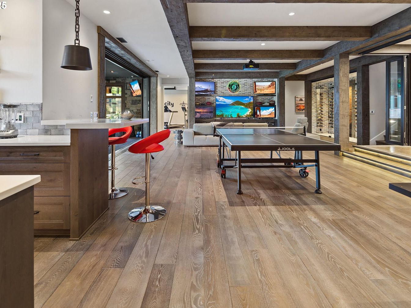 This spacious open-concept game room seamlessly connects to a cozy lounge area, offering an ideal environment for family gatherings and entertaining guests. Warm, wide-plank wood floors extend throughout, enhancing the inviting atmosphere. A stylish bar with sleek white countertops and modern wood cabinetry, paired with striking red bar stools, creates a vibrant focal point for socializing. Exposed wood ceiling beams add architectural interest, while large sliding glass doors fill the room with natural light. The space is designed for fun, featuring a central ping-pong table, plush sectional seating, and an impressive multimedia wall for games and movie nights, making it perfect for all ages.