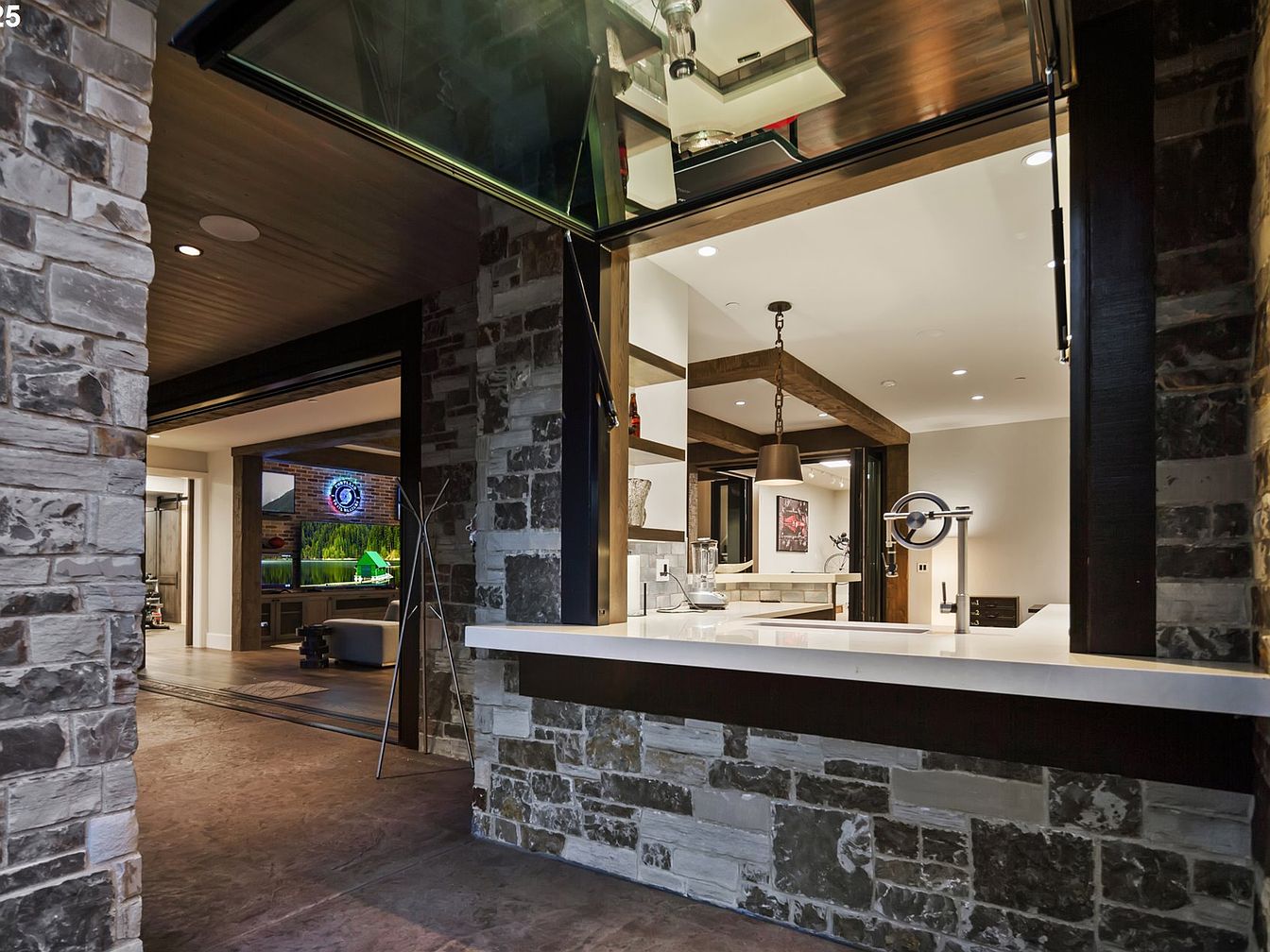 A modern farmhouse aesthetic is showcased with a spacious pass-through kitchen window that seamlessly connects indoor and outdoor living. Warm stonework frames the opening, complementing the rustic wood beams and ceiling details inside. The kitchen features sleek white countertops, pendant lighting, and open shelving for a balance of style and practicality. The layout encourages easy interaction between the kitchen and patio, making it perfect for family gatherings and entertaining. Comfortable sightlines allow adults to supervise children in adjacent spaces, while the neutral palette of earth tones, wood, and stone creates an inviting, family-friendly environment.