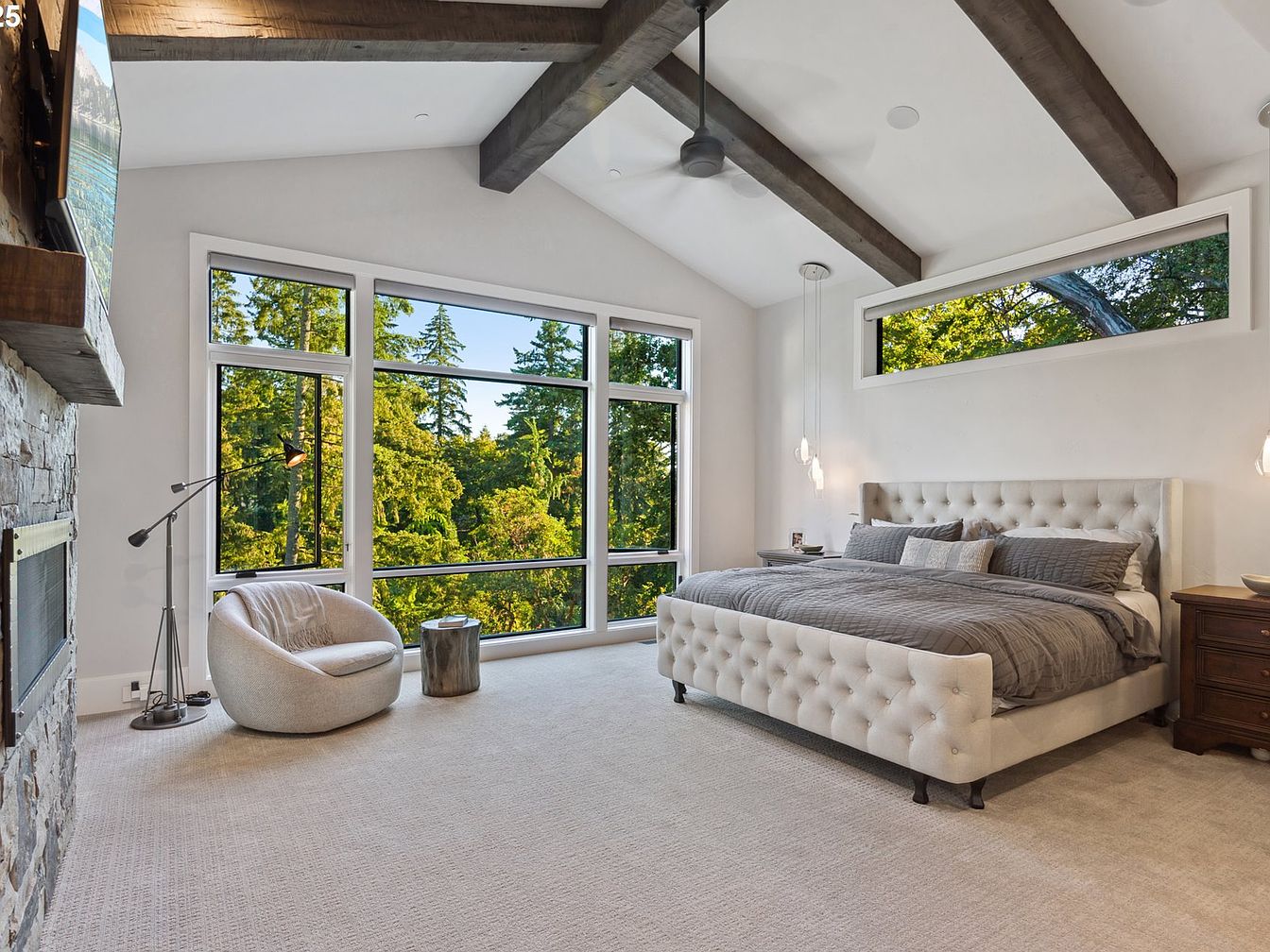 Expansive windows draw in natural light and highlight lush, scenic views, making this master bedroom a tranquil haven. The neutral palette of soft creams and moody grays complements the tufted headboard and bed frame, creating a sense of calm and modern elegance. Warm wood tones in the side tables and stone detailing on the fireplace add coziness, while exposed ceiling beams provide striking architectural interest. The spacious layout includes a comfortable reading nook with a contemporary swivel chair and sleek floor lamp, perfect for family relaxation or quiet moments. Plush carpet enhances comfort, ensuring a welcoming, family-friendly atmosphere.