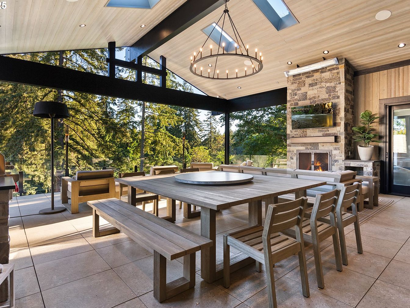 Spacious and inviting, this outdoor dining area features a large wooden table surrounded by both benches and chairs, perfectly suited for family gatherings or entertaining guests. The neutral palette of natural wood tones is complemented by stone-inspired tile flooring and a striking stone fireplace, providing warmth and ambiance. Floor-to-ceiling windows offer breathtaking views of the lush forest, flooding the space with natural light. Skylights overhead add an airy, open feel. Comfortable lounge seating by the fireplace encourages relaxation, while the clean architectural lines, potted greenery, and soft lighting create a modern yet cozy atmosphere for all ages.