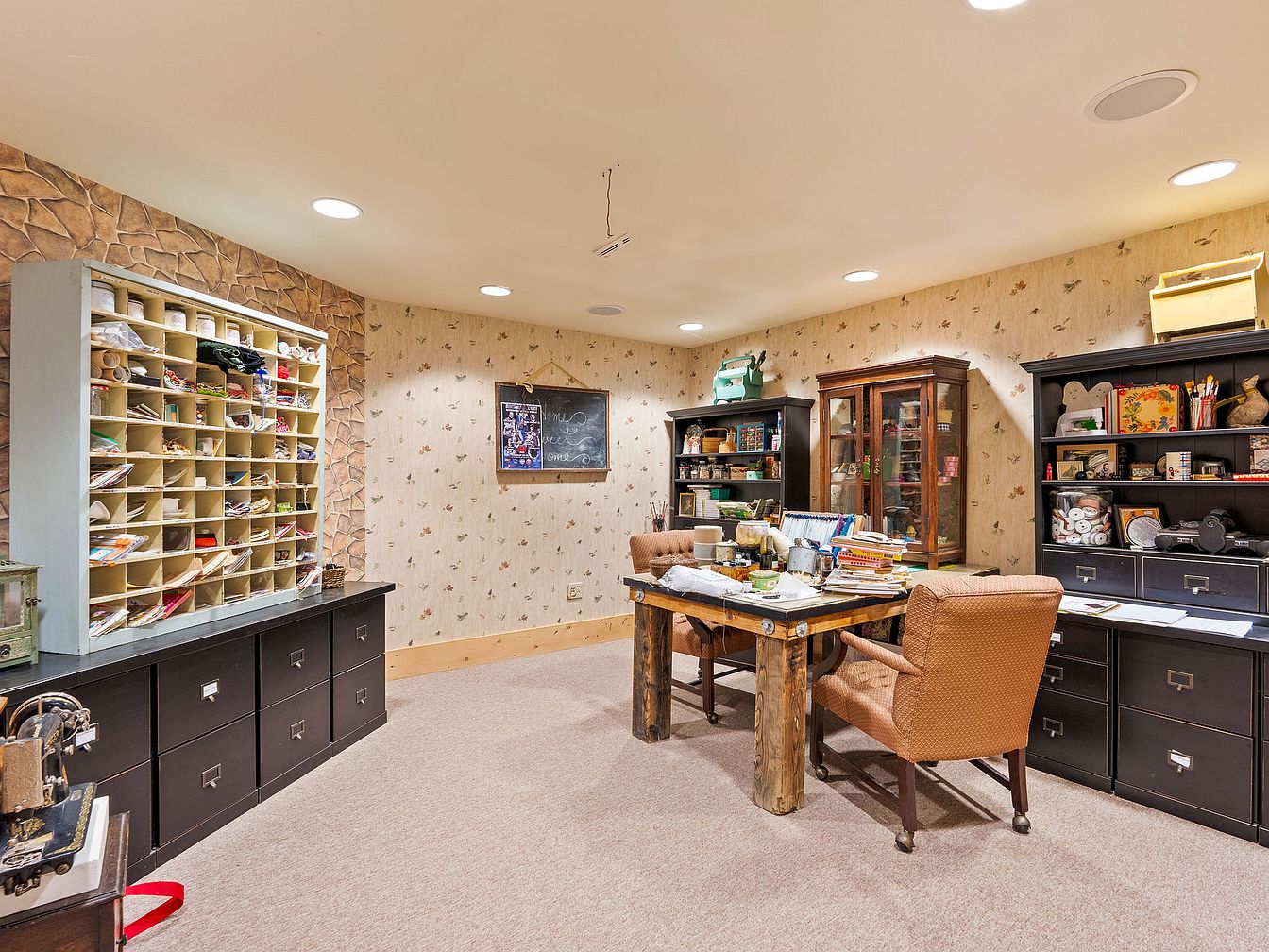 A spacious craft room designed for creativity and organization, featuring a rustic wooden table at the center surrounded by comfortable, upholstered chairs on wheels, making it ideal for collaborative family projects. The neutral tan color scheme is complemented by soft, patterned wallpaper and a faux-stone accent wall, adding warmth and character. Ample built-in shelving and cubbies provide storage for craft supplies, while glass-front cabinets and sturdy file drawers help keep materials neatly sorted. Recessed ceiling lights provide bright, even illumination for detailed work, creating a practical and welcoming environment perfect for adults and children alike to enjoy crafting together.