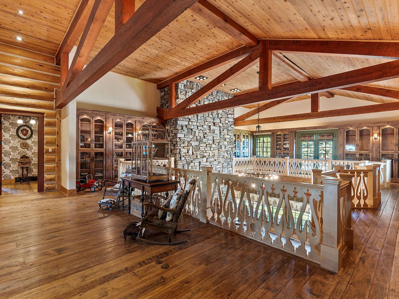 Warm wood tones infuse this loft landing, highlighted by exposed beams and a tongue-and-groove ceiling for authentic rustic charm. Stone accents on the central fireplace wall add a cozy, lodge-like feel. Built-in bookcases along the walls provide storage for family literature and treasures, while a rocking chair and toy tricycle contribute a nostalgic, family-friendly ambiance. The open railing with decorative bannisters ensures safety while maintaining sight lines across the space. Natural light from generous windows brightens the inviting area, making it ideal for play, reading, or quiet family moments. Earthy hues and vintage touches complete the welcoming atmosphere.