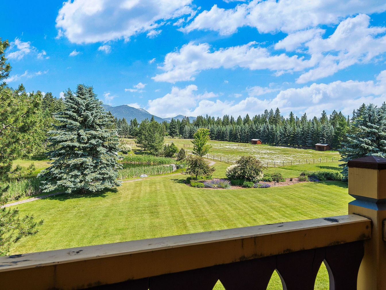 Expansive green lawns stretch out from the edge of the porch, providing a safe, open space for children to play and families to gather. Evergreen trees and manicured shrubs dot the landscape, while distant fenced pastures and small sheds hint at room for gardening or animals. The wide, unobstructed mountain views offer a serene, picturesque setting perfect for outdoor living. Softly rolling, lush grass blends seamlessly with flower beds and mature landscaping, all framed by the charming wooden porch railing. The area exudes a sense of tranquility and spaciousness, ideal for picnics, games, and enjoying nature together as a family.