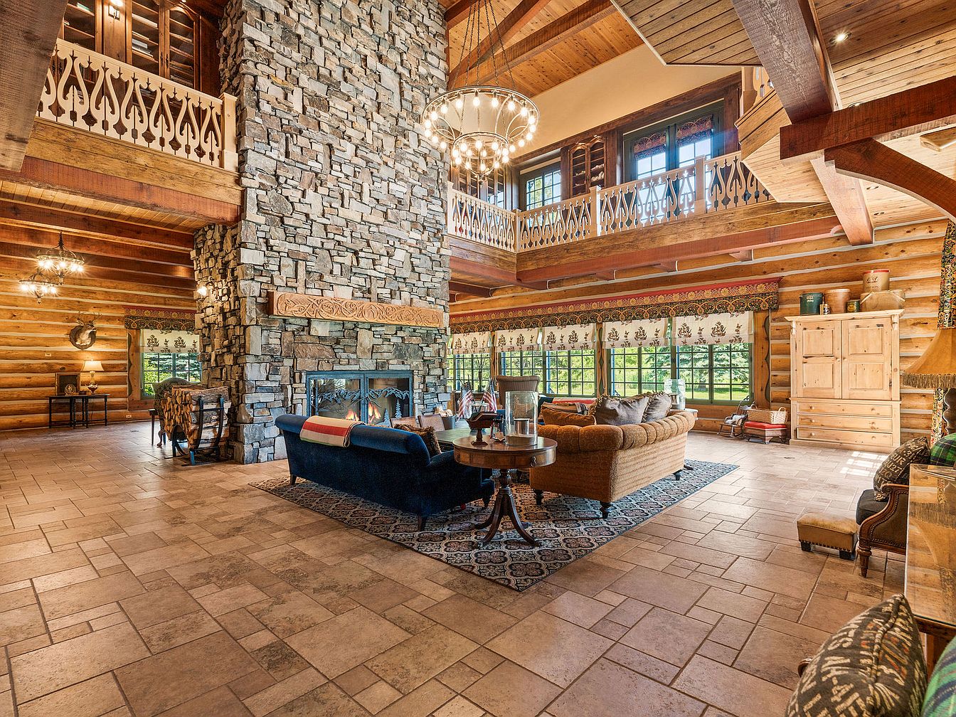 Spacious open-concept great room with a soaring stone fireplace as the focal point, flanked by generous windows that flood the space with natural light. The warm log cabin walls and exposed timber beams create a rustic yet inviting atmosphere, perfect for family gatherings and relaxation. Cozy, overstuffed sofas and armchairs arranged around the fireplace invite conversation, while an eclectic mix of colorful textiles adds charm. Double-height ceilings with dramatic chandeliers highlight the architectural scale, and a mezzanine with intricate railings overlooks the main area, offering visual interest and a sense of connection throughout the home—ideal for lively family life.