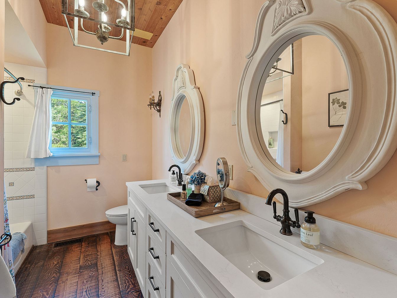 A welcoming bathroom features a spacious double vanity with white cabinetry and matching quartz counters, perfect for family use. Elegant framed oval mirrors above each sink add a touch of classic charm, complementing the soft peach walls and rustic wood-paneled ceiling. The room is bathed in natural light from a window with a simple white curtain, creating a cheerful and warm atmosphere. Matte black fixtures and vintage-style sconces provide subtle contrast and sophistication. The durable wide-plank wood floors and organized countertop make this bathroom both stylish and functional, ideal for busy family mornings and relaxing routines alike.