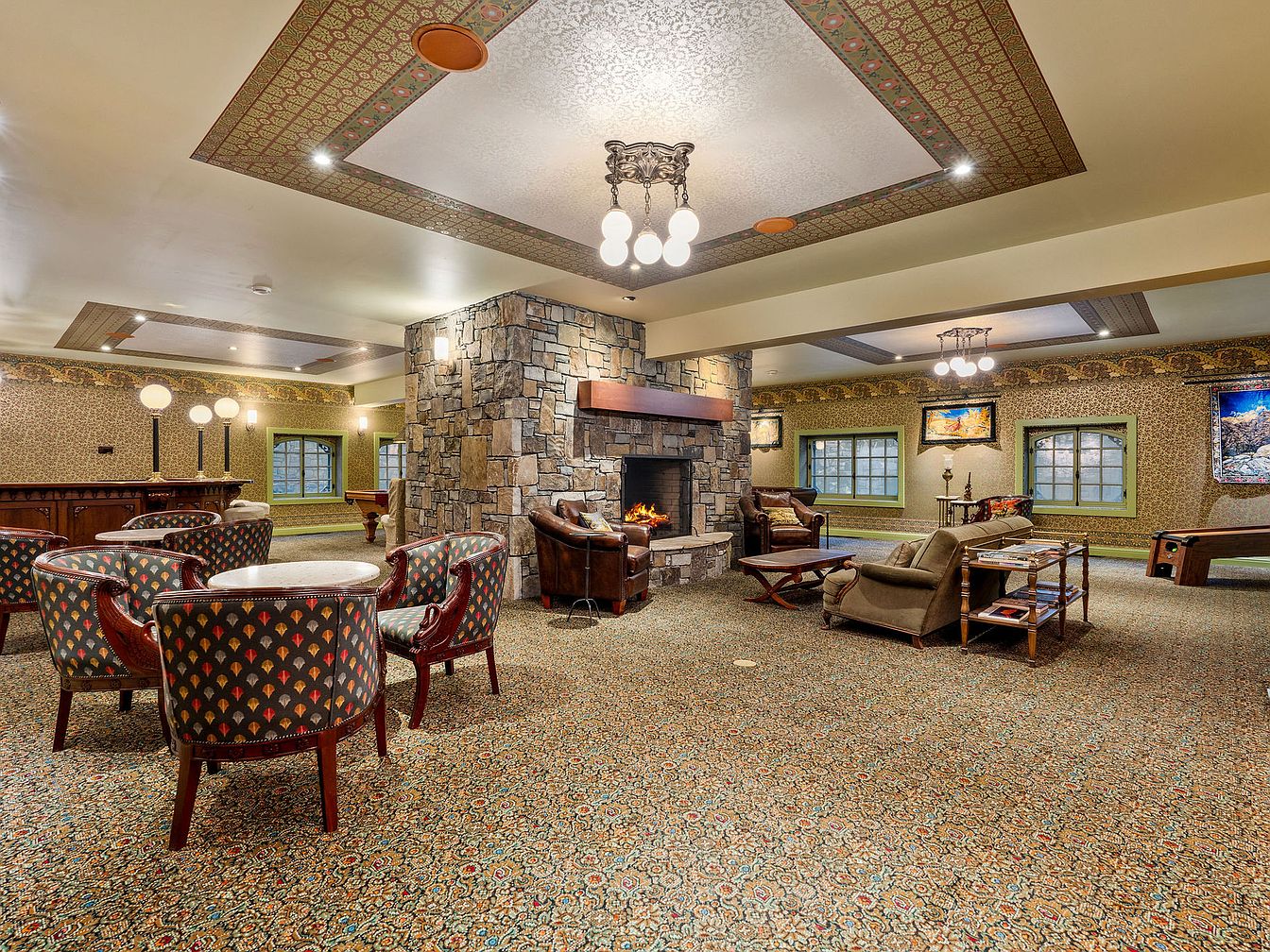 This spacious family game room features an inviting stone fireplace at its center, creating a warm focal point perfect for gatherings. The room blends vintage charm with comfort, boasting patterned carpeting and intricate ceiling designs that add rich visual interest. Plush armchairs and sofas are arranged in conversational groupings, making the space ideal for family game nights or entertaining guests. The bar area at the back pairs well with the cozy seating, while the presence of a pool table ensures fun for all ages. Large windows allow for natural light, enhancing the welcoming, friendly atmosphere throughout the room.