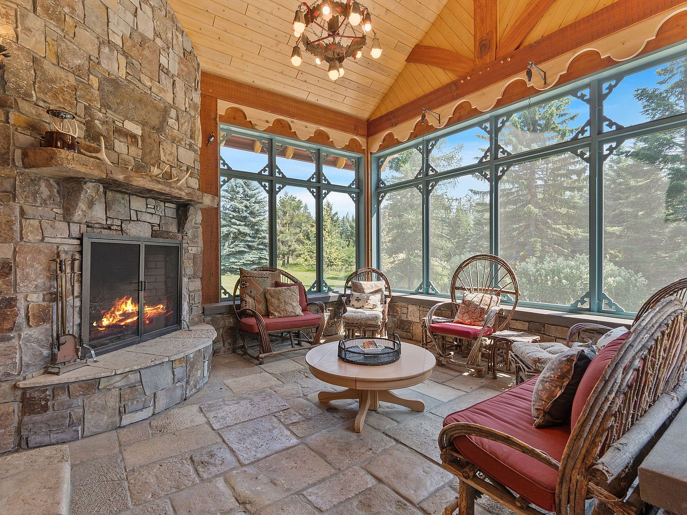 Warmth and comfort define this inviting sunroom, where a magnificent stone fireplace anchors the space, creating a cozy atmosphere for gatherings year-round. Generous windows flood the room with natural light, offering uninterrupted views of the lush green outdoors. The ceiling showcases exposed wooden beams with charming details, adding to the cabin-like appeal. Wicker furniture with plush cushions provides relaxed, family-friendly seating, perfect for conversation or enjoying a book by the fire. Earth-toned stone flooring and natural wood accents complement the surrounding landscape, while eclectic throw pillows introduce a touch of color and personality, making this sunroom ideal for leisure and family time.