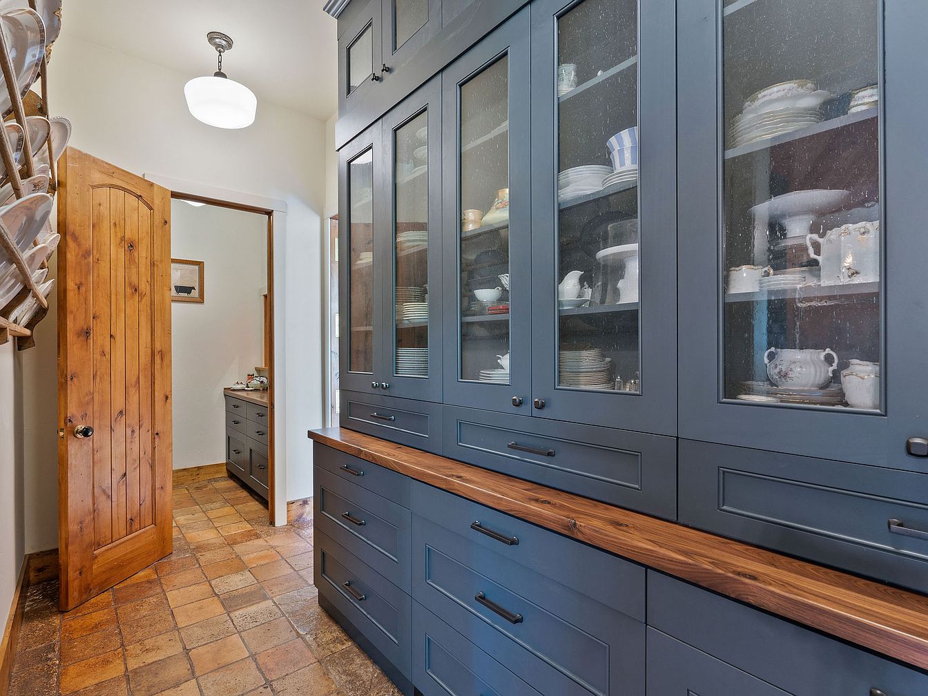 This spacious pantry features striking navy blue cabinets accented with a smooth wooden countertop and ample glass-front storage for crockery and dishes. The earthy terracotta tile flooring pairs naturally with the warm wood tones of the paneled door, creating a homely, welcoming vibe. Open shelving allows easy access to everyday items, while the cabinets ensure safety and organization for families. Clean white walls keep the area bright, and a modern light fixture ensures excellent illumination. This layout is both practical for food preparation and storage, and the cohesive materials lend timeless charm, making it ideal for busy family life.
