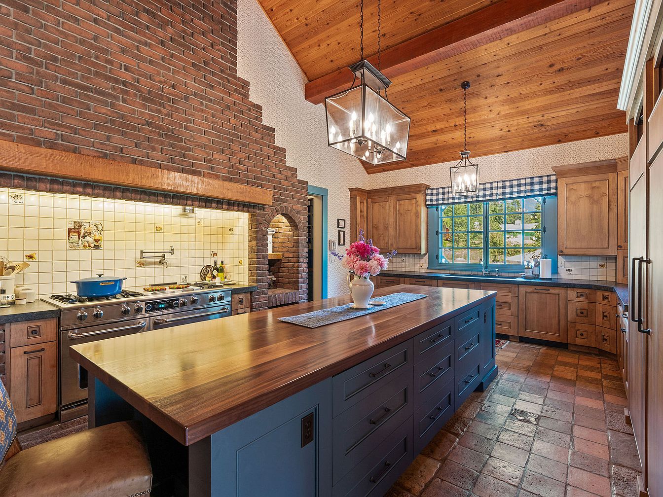Warm and inviting, this kitchen features a spacious central island topped with polished wood, ideal for family gatherings or preparing meals together. The rustic exposed brick wall adds character and frames the professional-grade range and built-in oven. Natural light floods through a large window dressed with a checked valance, highlighting the honey-toned wood cabinetry that provides ample storage. Terracotta tile flooring enhances the farmhouse charm, while two statement pendant lights suspended from a wooden, vaulted ceiling bring a cozy glow. Thoughtful touches like a central vase with fresh flowers create a welcoming and family-friendly atmosphere for everyone.
