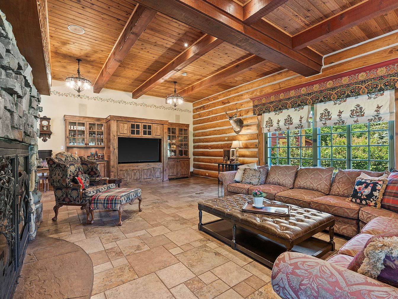 This spacious rustic living room features exposed wood beams on the ceiling and log cabin-style walls, providing a warm and inviting ambiance. The stone fireplace adds to the cozy mountain lodge aesthetic, complemented by natural stone tile flooring for durability and easy maintenance. Large windows allow natural light to flood in, making the space bright and cheerful for family gatherings. Overstuffed patterned sofas and armchairs create a comfortable environment, ideal for relaxation and conversation. The built-in wooden entertainment center and cabinets offer ample storage and display space, enhancing both function and family-friendly appeal. Decorative touches include floral curtains, antler wall decor, and traditional chandeliers.