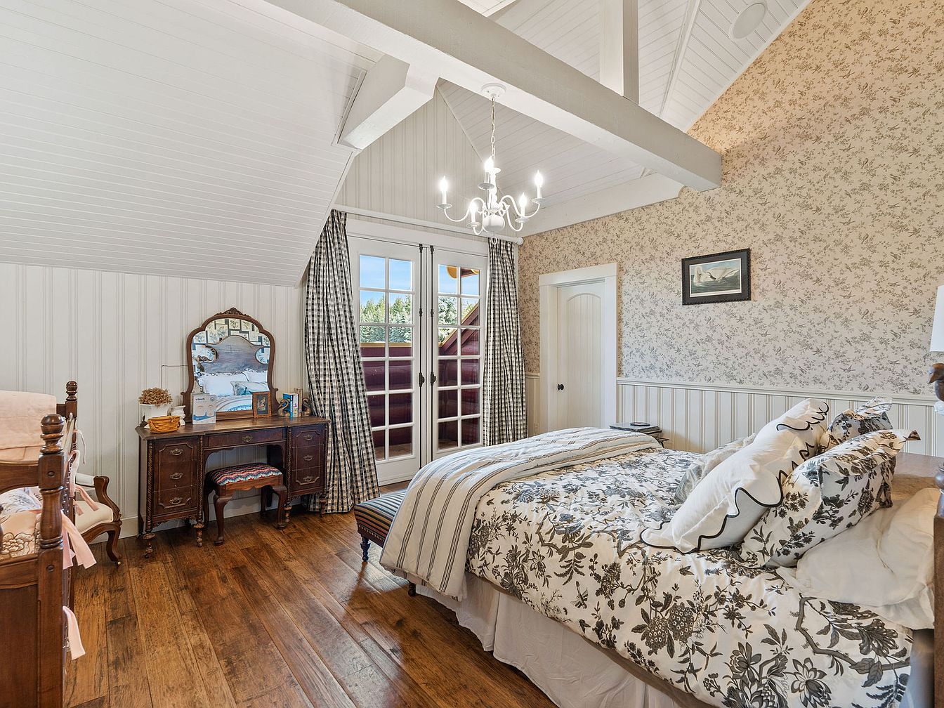 A welcoming bedroom featuring a pitched, white-paneled ceiling with exposed beams and soft floral wallpaper that adds a touch of classic charm. Natural light pours in through French doors leading to a balcony, creating an airy and bright atmosphere. The room is thoughtfully arranged with a large bed dressed in patterned linens, vintage wood furniture, and a vanity complete with a mirror and heirloom details, making it both family-friendly and comfortable. Warm hardwood floors, neutral tones, and subtle prints create a soothing environment ideal for relaxation and quality family moments, while the chandelier enhances the elegant cottage appeal.