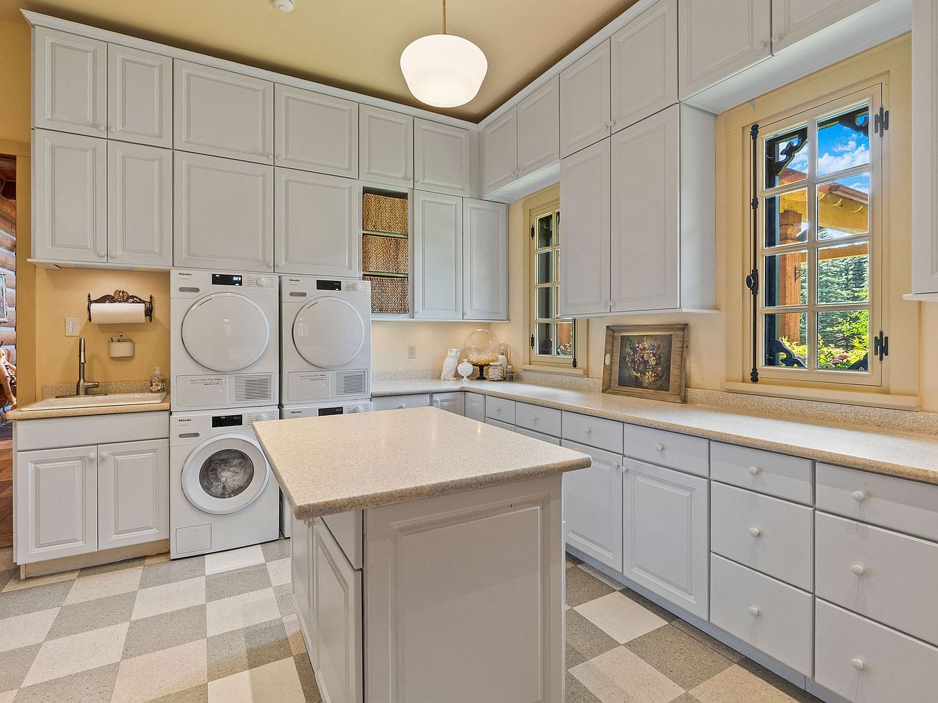Bright and inviting, this laundry room features a generous amount of white cabinetry that maximizes storage for household essentials. The soft beige countertops provide ample workspace, while an island in the center makes folding clothes and organizing easy for families. Practical design details include a stacked washer and dryer, deep utility sink, and checkered tile flooring that’s durable and easy to clean. Soft yellow walls and large multi-pane windows create a welcoming, sunlit atmosphere, while artful décor and built-in shelving balance utility and style. This space is thoughtfully designed to support the needs of busy, active households.