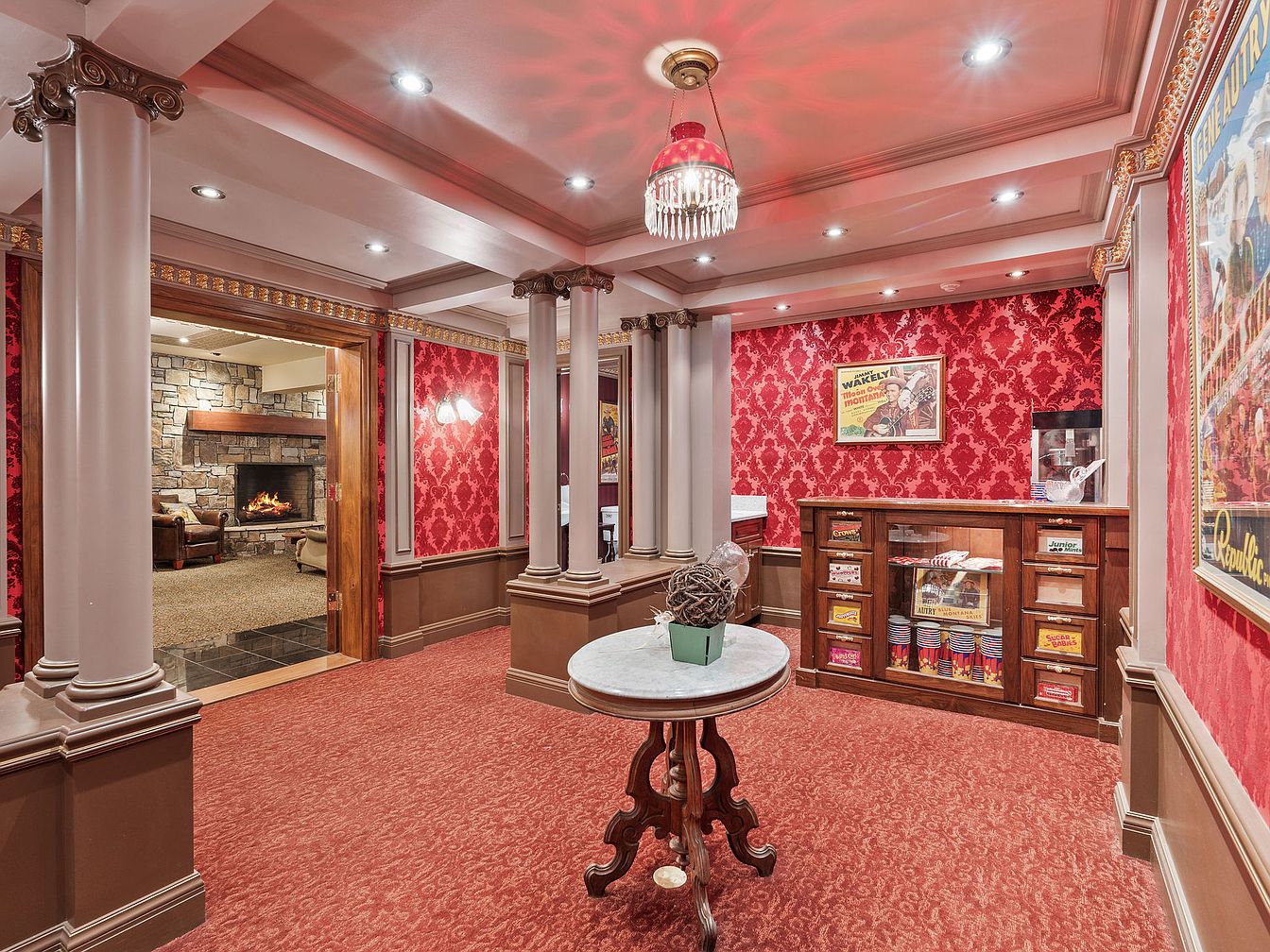 Step into a luxurious home theater lobby that channels the elegance of classic cinemas. Ornate columns and intricate crown moldings frame the space, while bold red damask wallpaper and plush carpet set a dramatic, inviting tone. A vintage chandelier with crystal details provides warm, ambient lighting, enhancing the old-Hollywood atmosphere. Framed movie posters add a nostalgic flair, and a glass-front concession stand features treats for all ages, perfect for family movie nights. The layout creates a family-friendly, social gathering space, seamlessly connecting to a cozy lounge area with a stone fireplace, ideal for relaxation before or after a film.