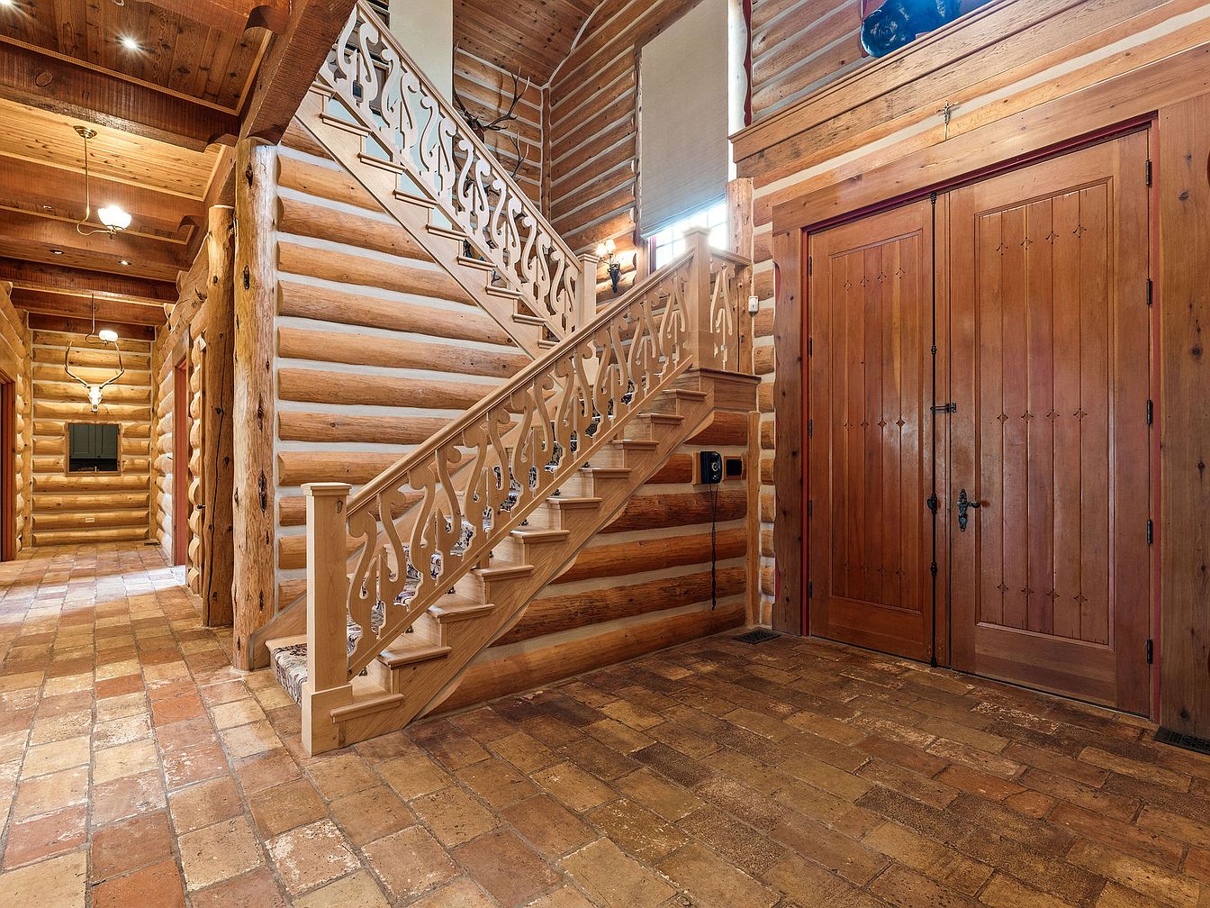 A welcoming log cabin entryway features grand double wooden doors that open into a spacious foyer filled with natural light. Warm wood tones dominate the space, from the patterned terracotta tile flooring to the round log walls and rustic timber beams overhead. An ornate wooden staircase with intricate, nature-inspired woodwork leads to the upper level, creating an inviting focal point. The open layout makes maneuvering easy for families, with wide walkways perfect for strollers or active kids. Decorative accents like antlers and hand-forged metal hardware enhance the cozy, lodge-like ambiance, offering both style and durability for family living.