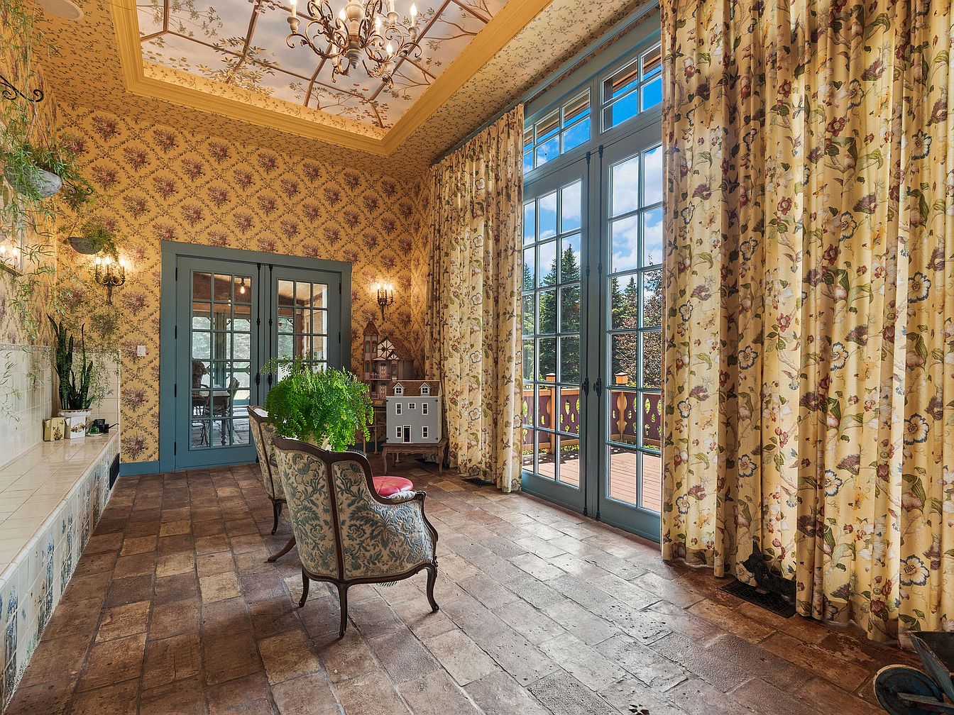 A bright and inviting sunroom opens to the outdoors through expansive blue-trimmed French doors, flooding the space with natural light. Floral wallpaper and matching drapery add warmth and charm, while a soaring ceiling adorned with an ornate chandelier and botanical mural creates an airy, elegant feel. The rustic tile floors pair beautifully with antique-inspired armchairs, providing a cozy spot for relaxation or family gatherings. Kid-friendly touches abound, such as a dollhouse and accessible plants, creating an atmosphere where children and adults alike can unwind. This sunroom seamlessly blends classic American decor with family comfort and everyday livability.