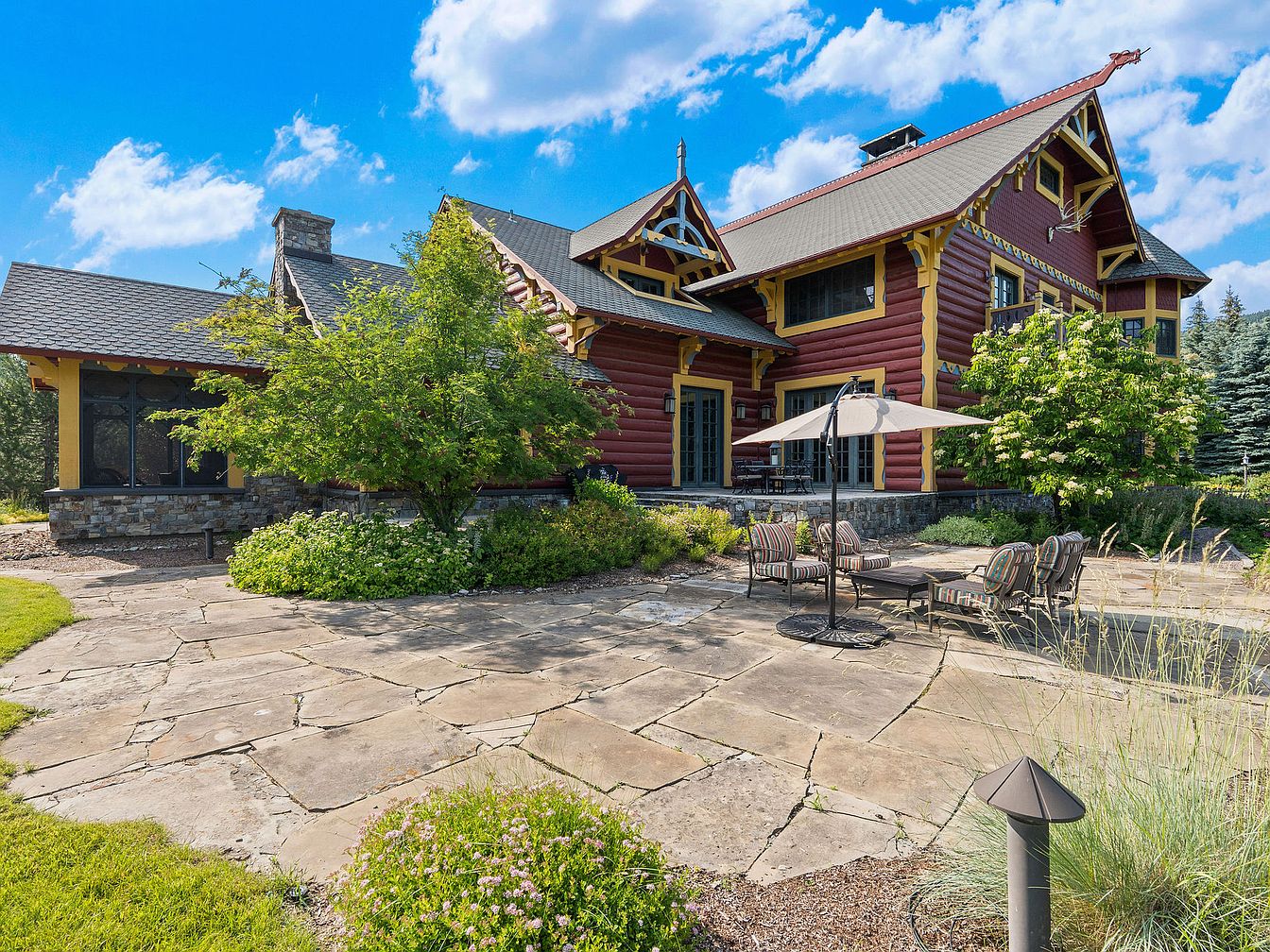 Expansive stone patio area blends rustic charm and modern comfort, perfect for outdoor gatherings and family relaxation. Surrounded by lush landscaping and mature trees, the space is equipped with ample seating, loungers, and a large umbrella, encouraging both leisure and socialization. The architectural style showcases striking red log exterior walls with yellow accents and decorative trim, while a sturdy stone base enhances the home’s natural elegance. The patio’s open layout provides children ample space to play and adults a serene atmosphere to unwind, all set against a backdrop of well-kept greenery and the striking, inviting façade of the house.