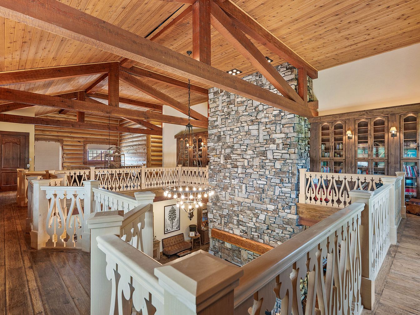A spacious loft landing features rustic charm and elegant craftsmanship, highlighted by exposed timber beams and a warm wood-paneled ceiling. The centerpiece is a grand stone fireplace that stretches up through both floors, adding a cozy, inviting touch. Custom built-in bookshelves provide ample storage for family collections and games, while ornate white railings wrap around the space, ensuring safety for children and making it ideal for families. The open-plan design allows for easy movement, beautiful natural light, and views into both the living area below and adjacent rooms, blending comfort with a welcoming, communal atmosphere.