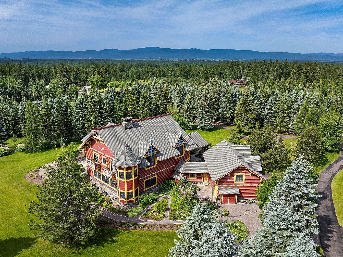 Nestled in the heart of a lush forest, this home is embraced by a sweeping mountain landscape and surrounded by mature evergreens for unparalleled privacy. The main house features a classic Americana style with a spacious layout, multi-gabled rooflines, and warm wooden exteriors complemented by stone accents. Manicured lawns and curved driveways offer plenty of space for children to play and families to gather outdoors. Thoughtfully landscaped pathways lead to additional outbuildings, enhancing functionality for family activities. The overall setting creates a serene, secluded retreat perfect for nature-loving families seeking comfort, space, and natural beauty.