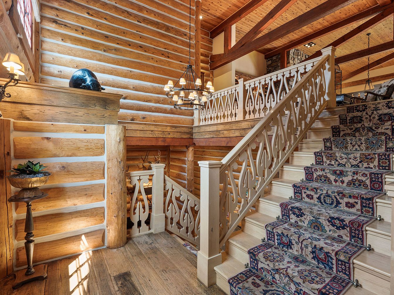 This welcoming staircase landing blends classic log cabin elements with rustic elegance, featuring sturdy log walls and exposed wooden beams that highlight natural textures. A decorative light wood railing with intricate cut-outs provides both safety and an artistic touch, making it family-friendly for households with children. The vintage-inspired runner with vibrant floral patterns adds warmth and color to the pale, polished wood stairs. Soft ambient lighting from wall sconces and a grand chandelier creates a cozy atmosphere, while unique details, including a sculpted bowl table and nature-inspired decor, infuse character into the space, creating a harmonious blend of comfort and style.