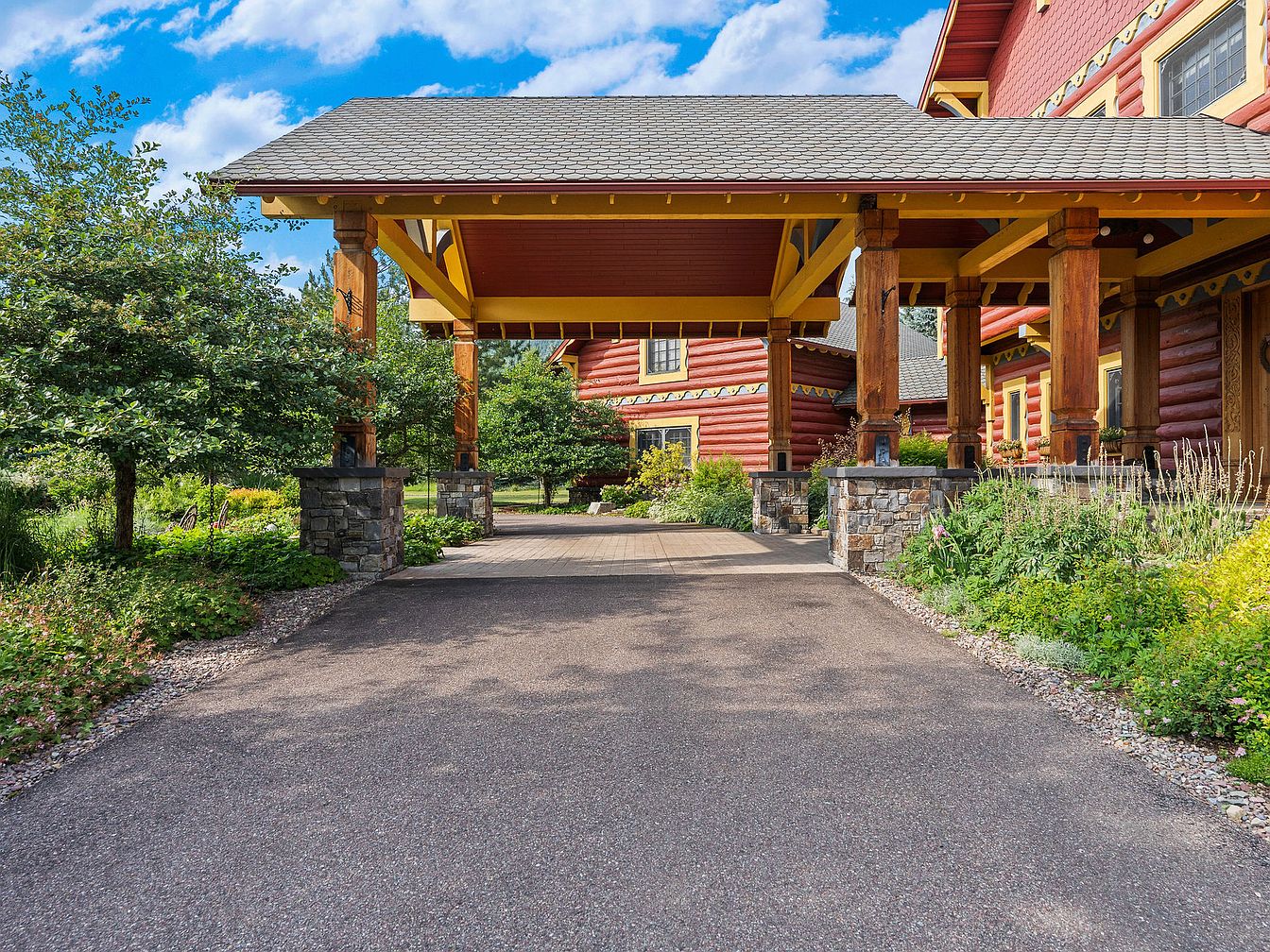 A grand covered entryway welcomes guests with a blend of rustic charm and elegance. The bold timber columns paired with stone bases create a sturdy, inviting passage while the red log exterior and yellow trim evoke classic American lodge style. Lush, landscaped gardens frame the wide driveway, offering both beauty and privacy. The ample covered space accommodates family gatherings, provides shelter from weather, and offers a convenient, kid-friendly drop-off zone. Large windows let in plenty of natural light, and the overall design emphasizes warmth, durability, and a welcoming atmosphere suited for active family living and social events.