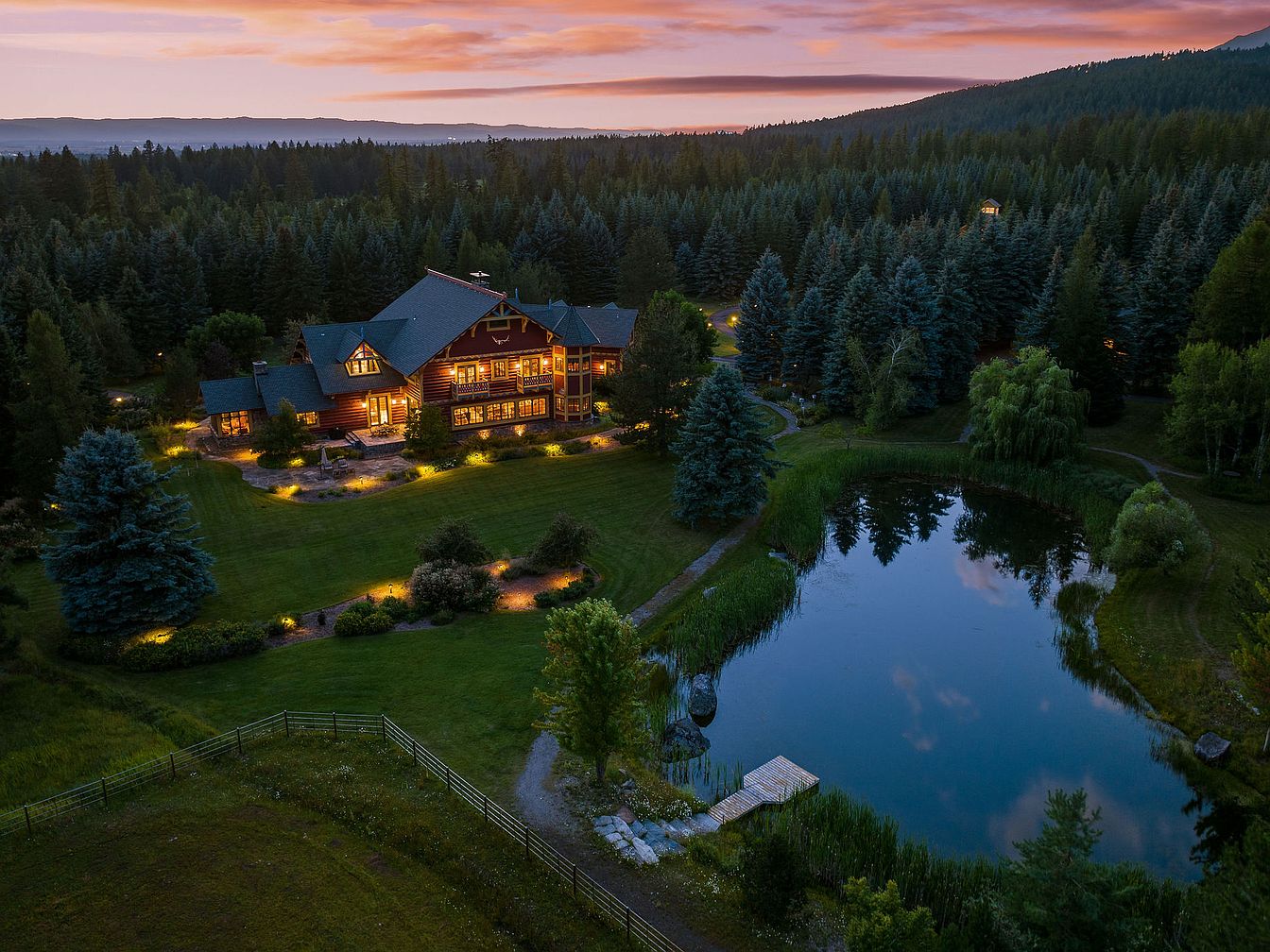 A sprawling backyard stretches out from a grand log-style American home nestled in a pine forest, illuminated warmly against a serene evening sky. Expansive lawns dotted with mature trees and artful landscaping create plenty of space for outdoor family activities, gatherings, or kids’ play. A tranquil pond with a wooden dock offers the perfect setting for fishing, canoeing, or just enjoying nature. The inviting architecture of the home features large windows, timber beams, and cozy outdoor lighting, blending traditional rustic charm with a welcoming, family-friendly ambiance that’s perfect for both relaxation and entertaining guests.