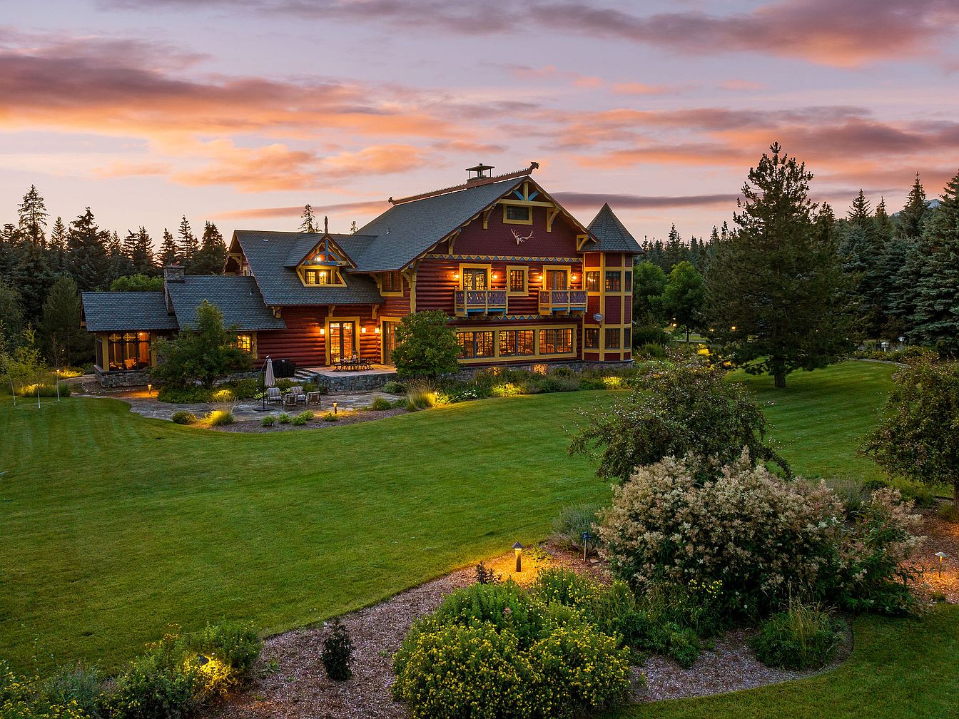 A striking log home sits nestled amidst expansive, lush green lawns and mature landscaping, perfectly blending rustic charm with modern comfort. Warm wooden beams, large windows, and traditional log detailing provide a welcoming façade, while soft outdoor lighting creates a cozy, inviting atmosphere at dusk. Plenty of outdoor seating and patio space offer a family-friendly setting for gatherings, play, and relaxation, with ample yard space for children and pets. The landscaping features thoughtful placement of shrubs, garden beds, and walking paths, all framed by towering trees and a backdrop of forest, evoking tranquility and privacy.