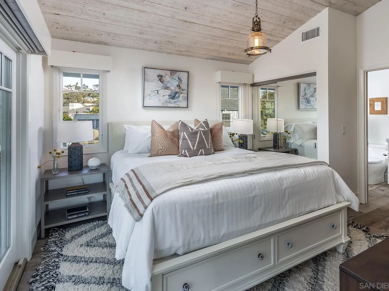 A calming and bright master bedroom offers a welcoming sanctuary with its high, lightly whitewashed wood plank ceiling and soft neutral tones throughout. The space features a plush bed with crisp white linens, accented by geometric throw pillows for added coziness. Ample natural light streams through large windows on either side of the bed, reflecting gently off mirrored closet doors to create a sense of spaciousness. Modern bedside tables and matching lamps, along with tasteful abstract artwork and a textured area rug, lend warmth and personality. Access to an en-suite bathroom and ample storage make this room ideal for families seeking both comfort and functionality.