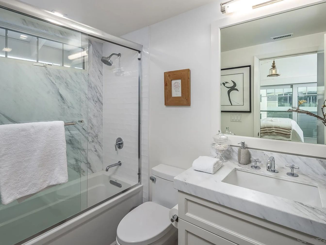 A bright, contemporary bathroom features clean lines and a soothing neutral palette with white and soft gray tones. The vanity boasts a luxurious marble countertop and matching backsplash, paired with chrome fixtures and sleek cabinetry for ample storage. The shower area, enclosed with clear glass panels, showcases sophisticated marble wall accents and a built-in towel bar for convenience. A large mirror above the sink enhances light and space, while minimalistic wall art and tasteful decor add a refined touch. Thoughtful family-friendly details, such as accessible towel placement and a combined tub and shower, make this bathroom both stylish and practical.