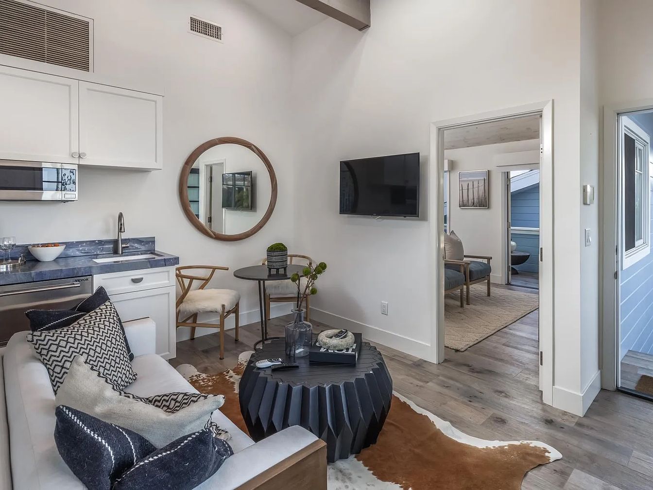 A bright and inviting living space combines modern style with comfort, featuring an open layout that flows seamlessly into an adjoining sitting area. The palette of soft whites and cool blues enhances the room’s airy ambiance, while wood accents and a cowhide rug add warmth and texture. A compact kitchenette includes blue stone countertops and sleek cabinetry, perfect for family meals or entertaining. The plush sofa, accented with patterned pillows, faces a sculptural black coffee table and a mounted television for family movie nights. Large windows and a round mirror amplify natural light, making the area feel welcoming and spacious.