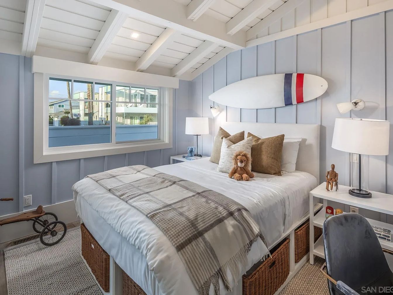 Soft periwinkle wall paneling and a vaulted white ceiling create a bright, welcoming atmosphere for this child-friendly bedroom. A surfboard above the bed adds a playful coastal touch, while a plush lion toy and woven storage baskets under the bed enhance practicality and coziness. The large window allows plenty of daylight and views of the surrounding homes, ideal for a sunny, cheerful vibe. Light-colored bedding and neutral throw pillows complement the crisp blue tones, while a sturdy side table, twin lamps, and whimsical decor promote both functionality and comfort for a growing child.