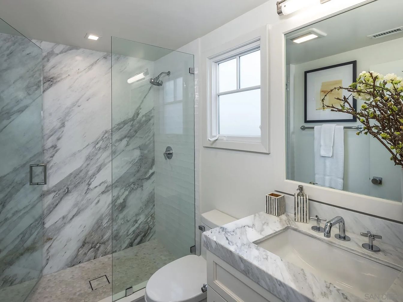 This modern bathroom features an elegant design with a spacious glass-enclosed shower showcasing striking marble walls that add a luxurious touch to the space. The white vanity is topped with a matching marble countertop, complemented by sleek chrome fixtures. Natural light flows through a large window above the toilet, enhancing the room’s airy, fresh atmosphere. Thoughtful accents like a decorative vase of white blooms, striped accessories, and framed wall art add warmth and personality while soft white towels bring extra comfort. The clean lines, neutral palette, and practical layout make this bathroom functional and welcoming for families.