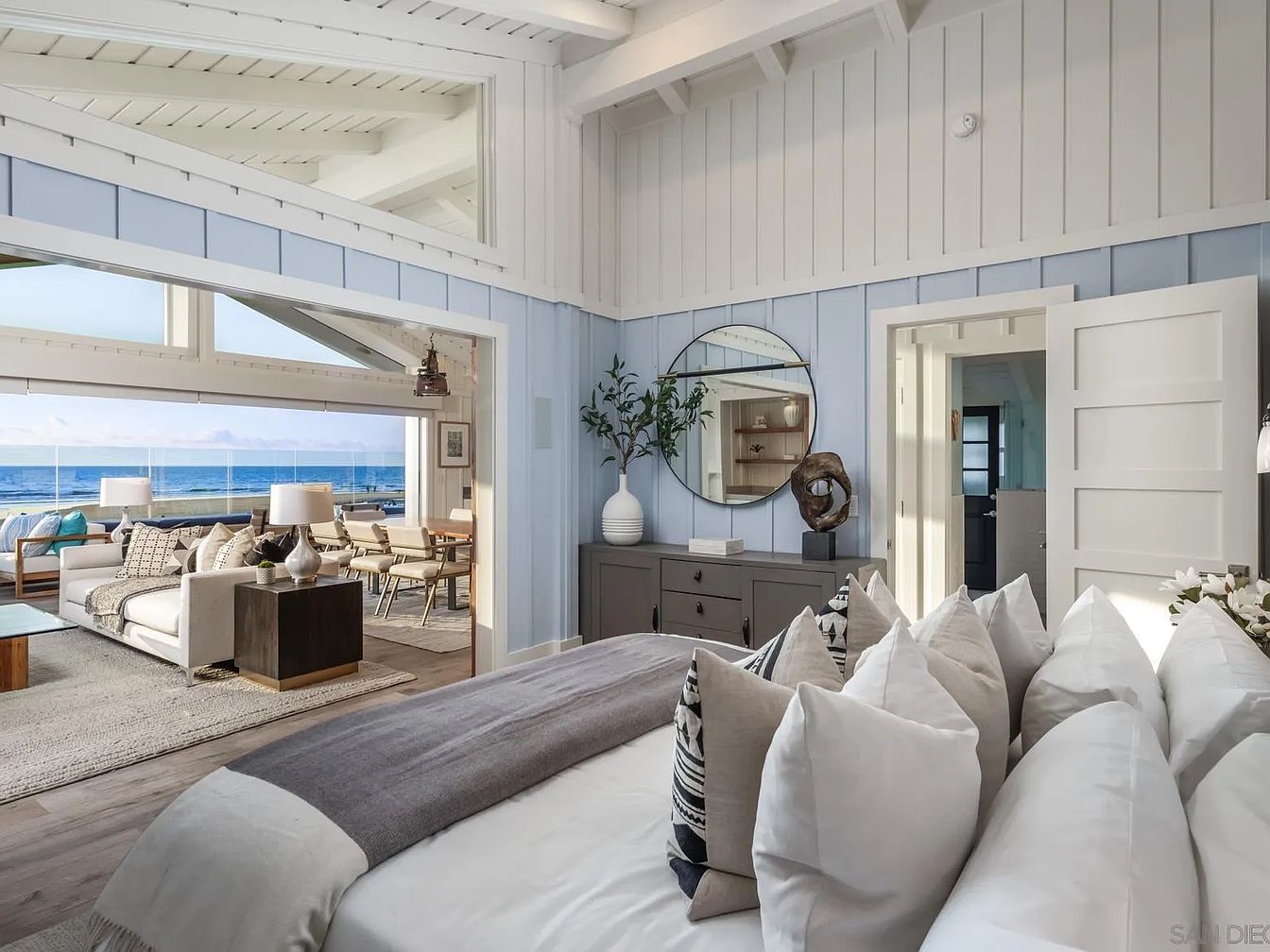 This tranquil master bedroom features a fresh coastal palette with soft blue and white wall paneling, creating a light, airy feel. Crisp white bedding layered with plush pillows rests atop a cozy bed that faces floor-to-ceiling windows and sliding doors, seamlessly transitioning to an expansive living area and breathtaking ocean views. Family-friendly touches include ample seating and open space for relaxation or gathering. Architectural details like vaulted ceilings with exposed beams, neutral-toned wood floors, and large mirrors add to the clean, beach-inspired aesthetic. Modern accents, organic decor, and soft, natural light complete this inviting and elegant retreat.