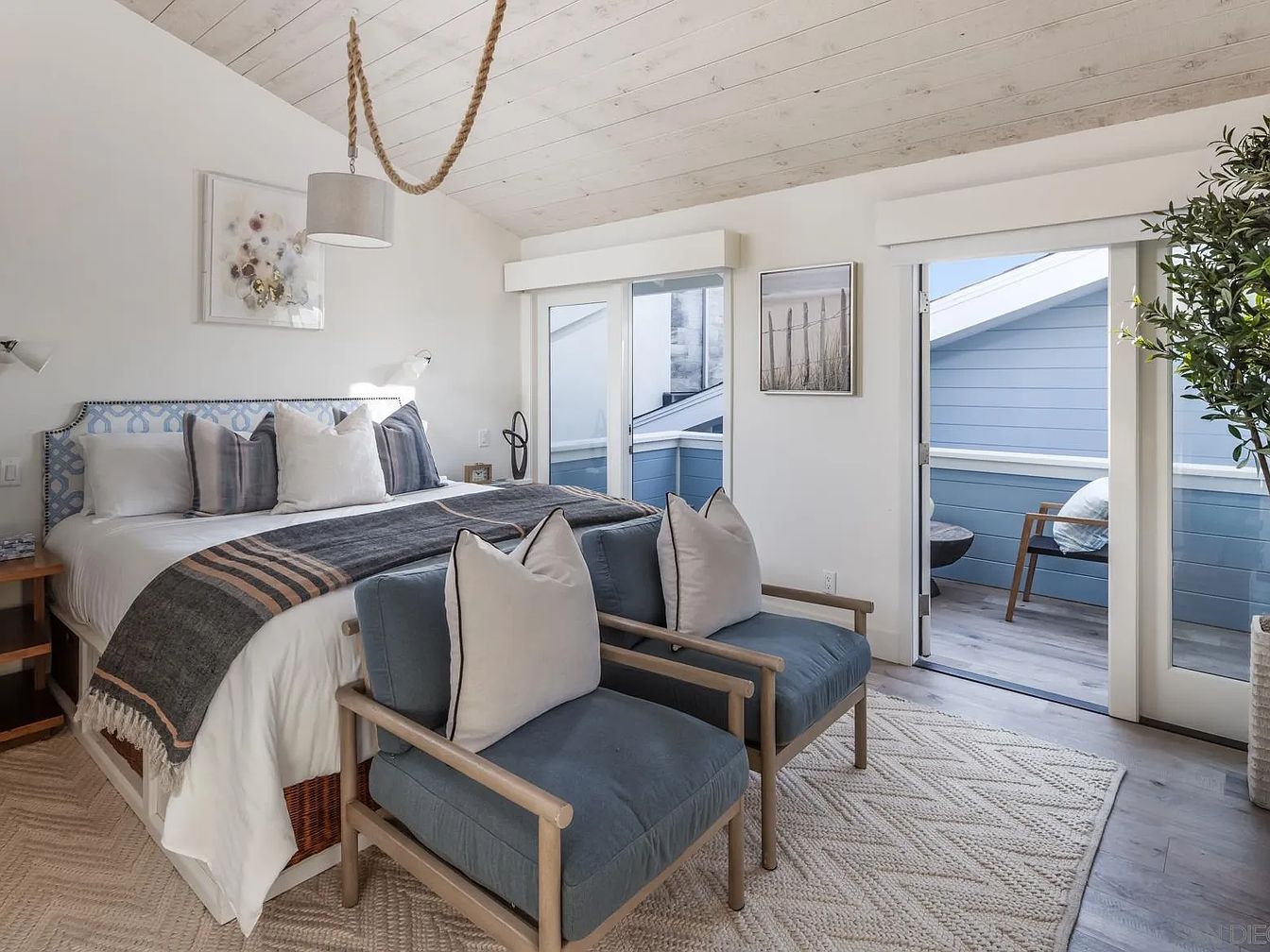 A serene master bedroom designed for relaxation and comfort, featuring a vaulted shiplap ceiling that enhances the openness of the space. Large glass doors lead to a private balcony, allowing natural light to fill the room and providing easy access for indoor-outdoor living. Calming neutral tones are accentuated by deep blue armchairs and cozy, plush pillows, while layered textures from the woven rug and throw increase the room’s inviting feel. Subtle wall art and minimalist furniture add a touch of elegance, making this space welcoming for families seeking a retreat to unwind together.