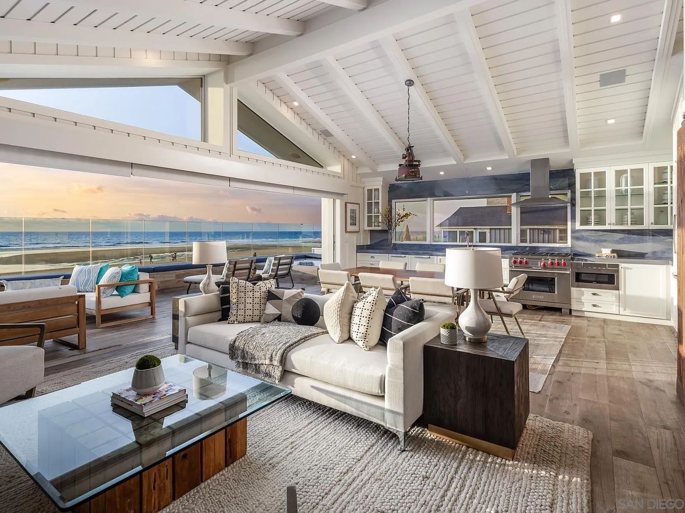 Spacious open-concept living area blends seamlessly with the kitchen, featuring vaulted white wood-beamed ceilings and wide-plank wood flooring. A wall of glass doors frames a breathtaking ocean view, flooding the space with natural light and inviting in the coastal breeze. The living area is furnished with plush, neutral-toned sofas layered with textured throw pillows and cozy blankets, perfect for family gatherings. A modern glass coffee table sits atop a thick woven rug, while the adjacent kitchen features high-end appliances, clean white cabinetry, and a unique blue marble backsplash. Ample seating makes this an inviting space for entertaining and everyday relaxation.