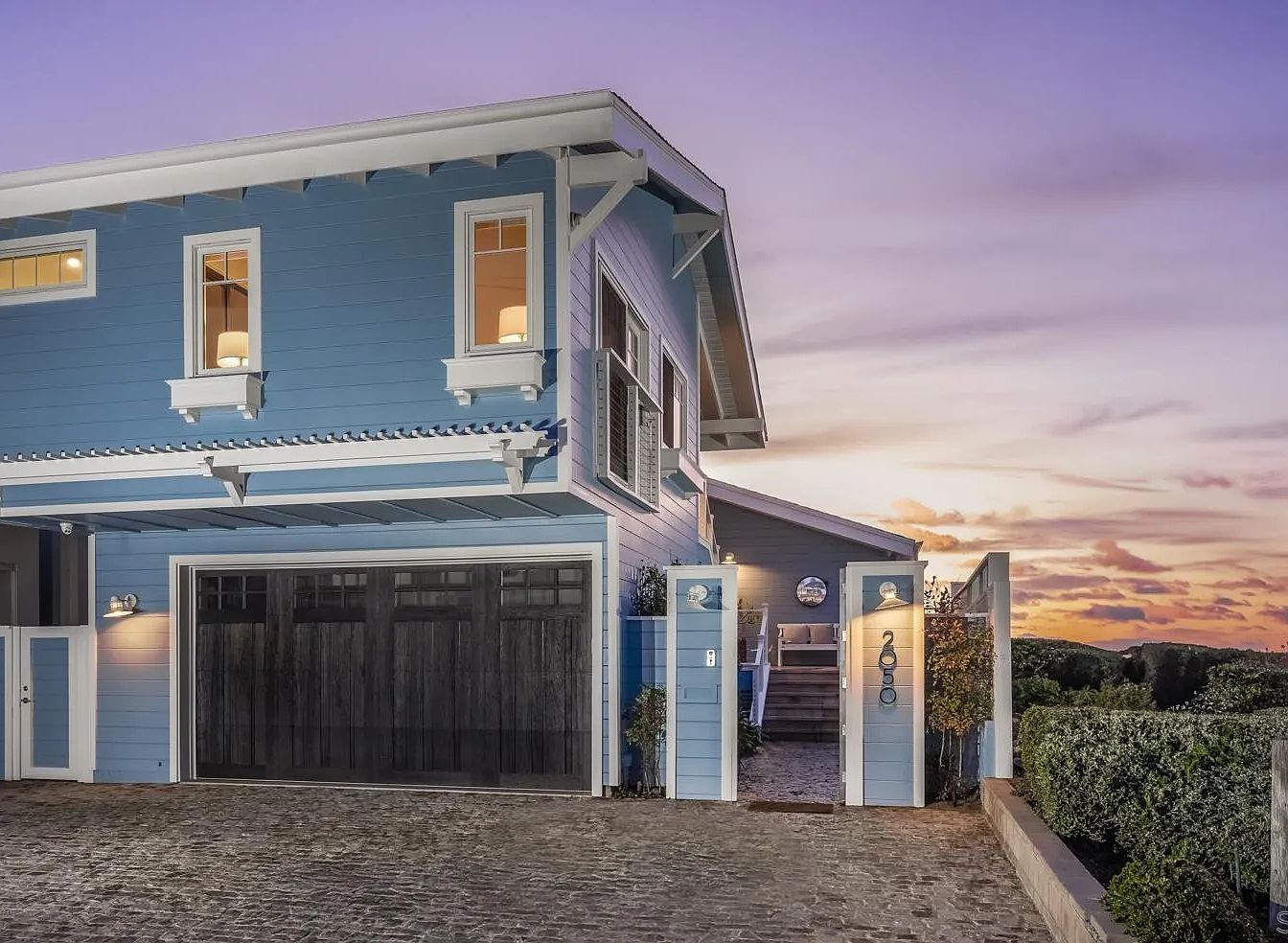A charming blue exterior welcomes you to this thoughtfully designed American home, featuring crisp white trim and craftsman-style details under the eaves. The wide driveway, paved with cobblestones, leads to a substantial, dark wood garage door, ideal for family vehicles or extra storage. The illuminated entry gate and pathway offer a safe, inviting route to the front door, enhanced by manicured hedges and ambient lighting. Upstairs windows allow natural light to fill the interior, reflecting a warm and family-friendly atmosphere. The sunset backdrop enhances the tranquil, coastal-inspired color palette, creating a picturesque curb appeal for visitors and residents alike.