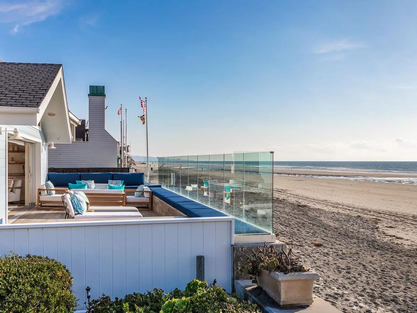 A spacious patio seamlessly blends indoor and outdoor living, with a natural wood dining table and comfortable woven chairs perfect for family gatherings or sunset meals overlooking the ocean. The light blue exterior of the home complements the coastal setting, while sturdy glass panels provide unobstructed views and safety, making the space inviting for families with children. The area is enhanced by simple greenery centerpiece, creating a laid-back yet stylish atmosphere. The wooden deck flows toward a built-in hot tub, ideal for relaxing together, and direct beach access makes this a true haven for family leisure and entertaining.