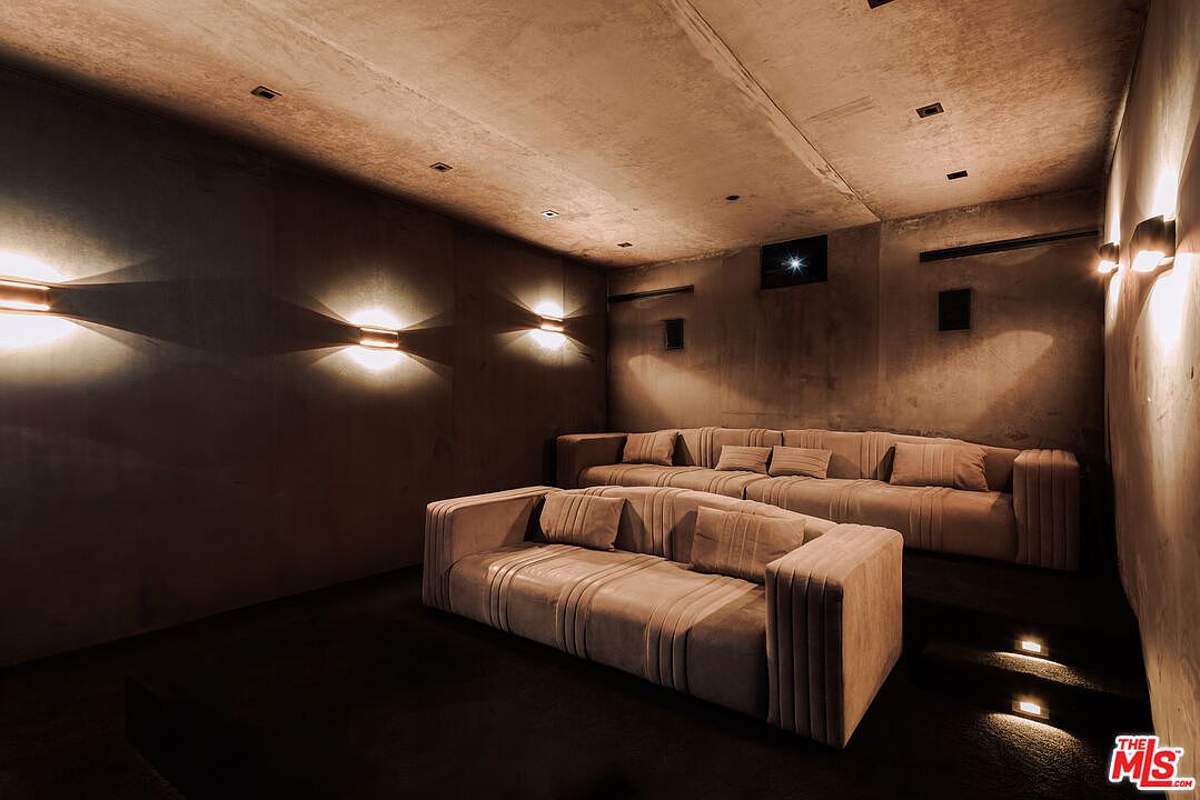 This dedicated home theater features plush, tiered sofa seating, making it perfect for family movie nights or entertaining guests in comfort. The minimalist design incorporates soft, neutral-toned upholstery and built-in accent lighting along the walls, creating a cozy yet modern atmosphere. The room’s concrete-style walls and ceilings contribute to a cinematic, sound-optimized environment. With its spacious arrangement, families can sit together or spread out, and the layered seats ensure an unhindered view from any spot. The overall design emphasizes both function and inviting aesthetics, offering an immersive, stylish entertainment space.