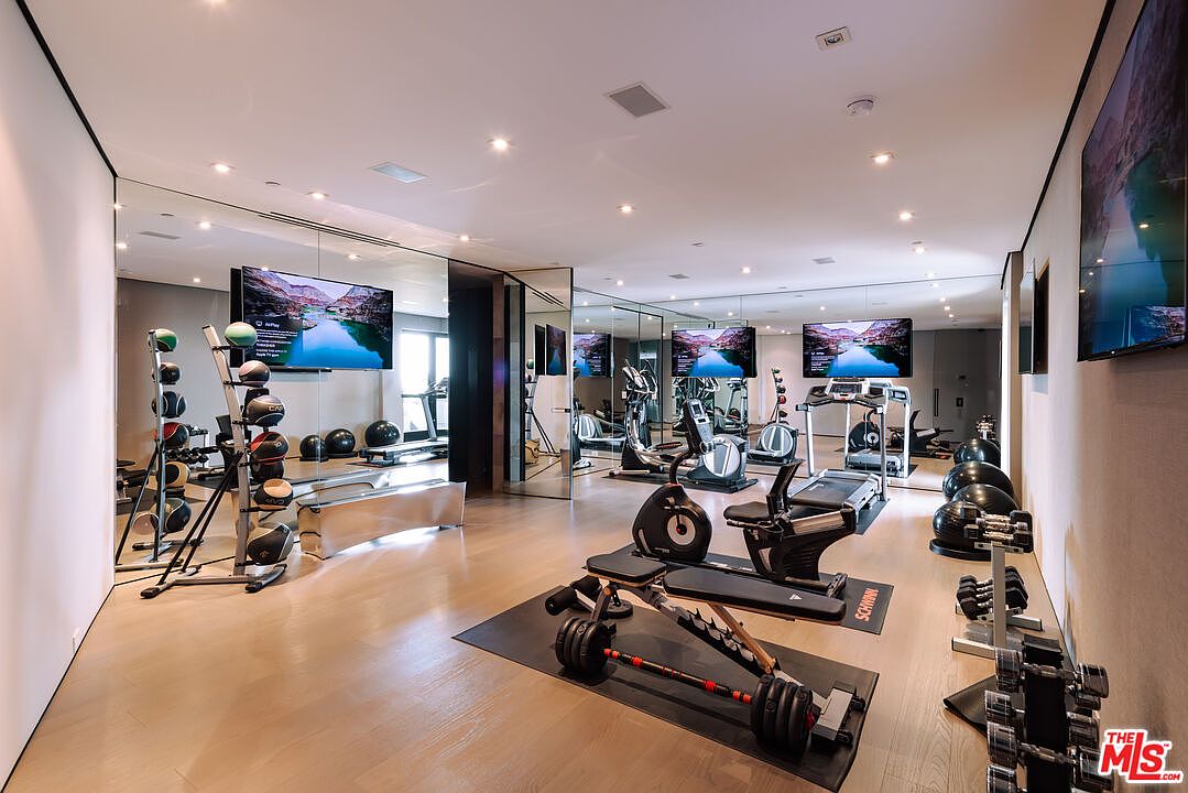 This spacious home gym is designed with both functionality and aesthetics in mind, perfect for family workouts or solo training sessions. Expansive wall-to-wall mirrors enhance the sense of openness, reflecting natural light from a large window and creating a motivating atmosphere. The light hardwood floors seamlessly blend with neutral walls and recessed ceiling lights, giving the gym a crisp, modern feel. State-of-the-art cardio equipment, free weights, exercise balls, and kettlebells are thoughtfully organized for safe, easy access. Mounted flat-screen TVs provide entertainment or virtual guided workouts, making this gym an inviting space suitable for every fitness level.