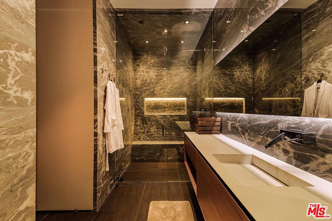 This luxurious bathroom combines sleek, contemporary design with dramatic marble walls running seamlessly from the floors to the ceiling, creating a spa-like atmosphere. The spacious glass-enclosed shower features an elegant built-in bench and recessed backlighting, perfect for relaxing at any time of day. The floating vanity boasts a long, rectangular trough sink and under-counter lighting, offering both style and functionality for families. Warm, earthy tones are complemented by soft, modern lighting and thoughtful details, such as plush robes and wooden accents, ensuring both visual appeal and an inviting, family-friendly ambiance.