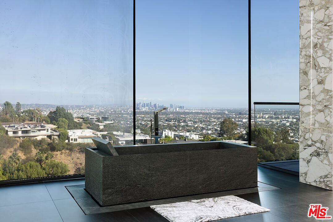 A stunning bathroom retreat featuring a sleek, rectangular stone tub positioned before floor-to-ceiling windows that provide an unobstructed panoramic view of the city skyline. The open layout maximizes serenity and natural light, while the frameless glass gives a seamless transition between indoors and outdoors. Modern, monochrome floor tiles and a touch of luxury from the marble accent wall elevate the space’s elegant aesthetic. A plush white rug adds warmth and comfort, making the space both family-friendly and inviting. The minimalist design, clean lines, and sophisticated materials create an atmosphere of relaxation for anyone to unwind.