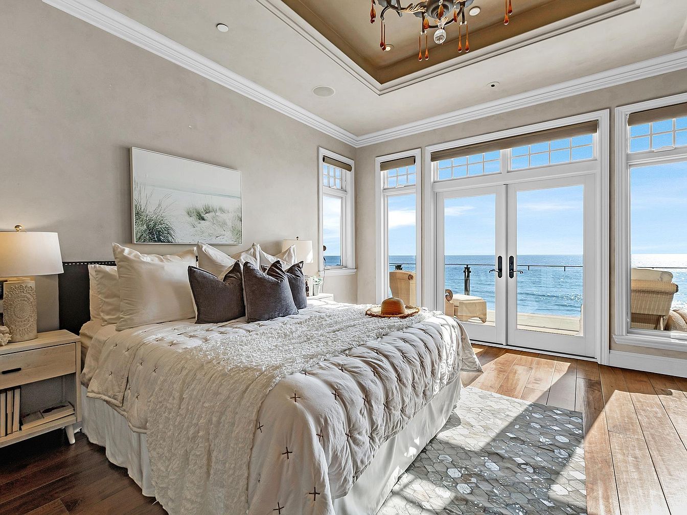 A serene master bedroom retreat featuring breathtaking ocean views through expansive French doors and tall windows, filling the room with natural light. The room is anchored by a plush, inviting bed layered with crisp white linens, soft throw blankets, and accent pillows in calming tones. Warm wood flooring adds a sense of coziness, while coastal art and elegant bedside lamps enhance the tranquil atmosphere. A spacious layout and gentle color palette of creams and sandy beiges create a restful space perfect for families desiring comfort and relaxation, with direct access to a private patio for peaceful outdoor moments.