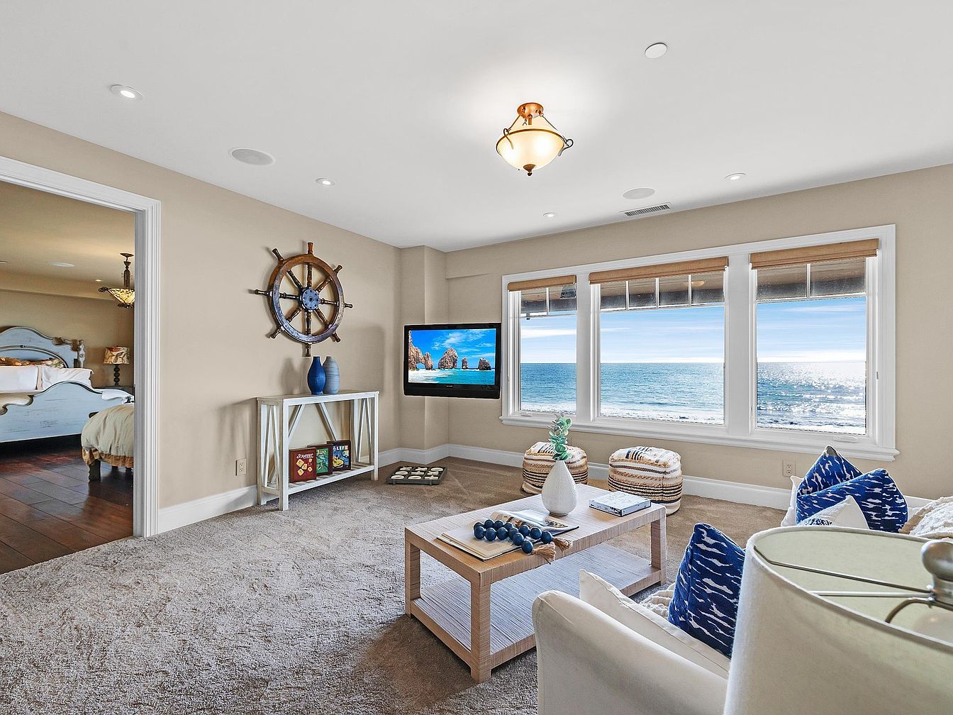 Bright and inviting, this family lounge boasts stunning ocean views framed by large picture windows, offering a serene coastal retreat. The room features a soft beige and white color palette, paired with nautical-inspired decor such as a ship’s wheel and accents in blue and tan. Plush carpeting ensures a kid-friendly, comfortable play area, while poufs provide extra casual seating. The open layout includes a cozy sofa adorned with marine-themed pillows, a light wood coffee table, and a corner TV for family entertainment. An adjoining bedroom is visible, creating a seamless, open connection ideal for family living.