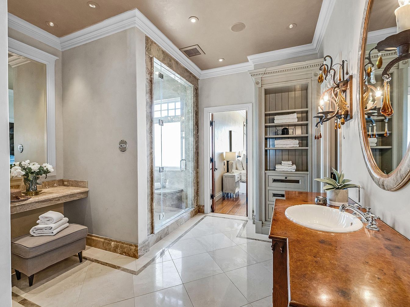 A spacious master bathroom featuring elegant marble tiles and refined crown molding for a touch of timeless sophistication. The layout is thoughtfully designed with a large glass-enclosed shower, custom built-in shelving for storage, and a classic wooden vanity that brings warmth to the neutral color palette. Practical amenities like generous counter space, a cushioned bench, and plenty of neatly arranged towels make it family friendly and convenient for daily routines. Decorative elements such as ornate sconces, a round framed mirror, and fresh flowers create a soothing, inviting atmosphere ideal for relaxation and self-care.
