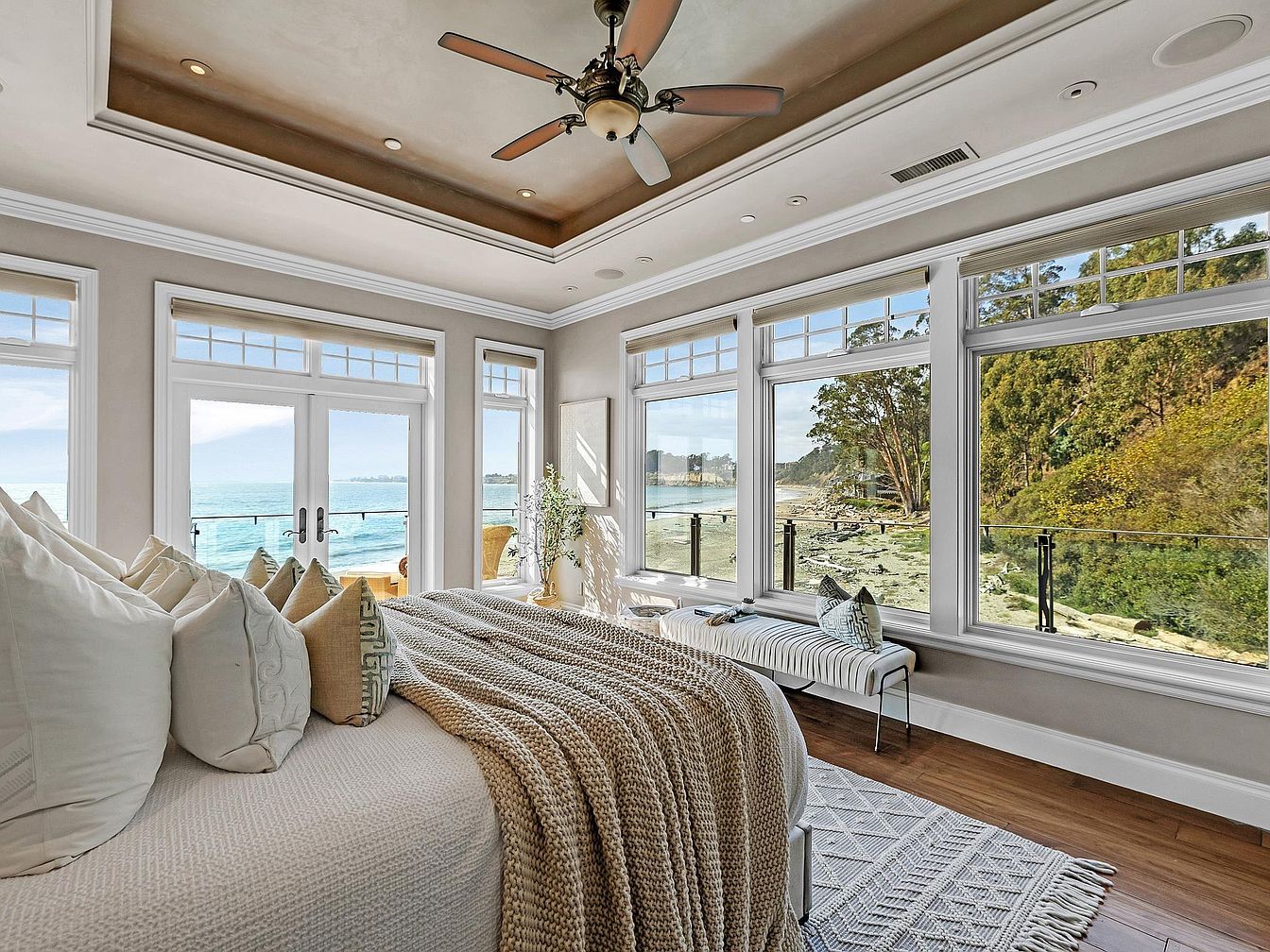Experience coastal serenity in this expansive master bedroom featuring floor-to-ceiling windows that provide panoramic ocean and woodland vistas. The layout maximizes natural light, with a central bed oriented to enjoy the breathtaking scenery. Neutral tones dominate the room, with soft beige walls, creamy bedding, and textured throws offering a cozy, inviting atmosphere perfect for families. Elegant white trim, warm hardwood floors, and a modern tray ceiling with a statement fan add architectural interest. A cushioned bench by the windows provides a spot for relaxation or reading, enhancing this peaceful retreat designed for comfort and enjoying the beauty outdoors.